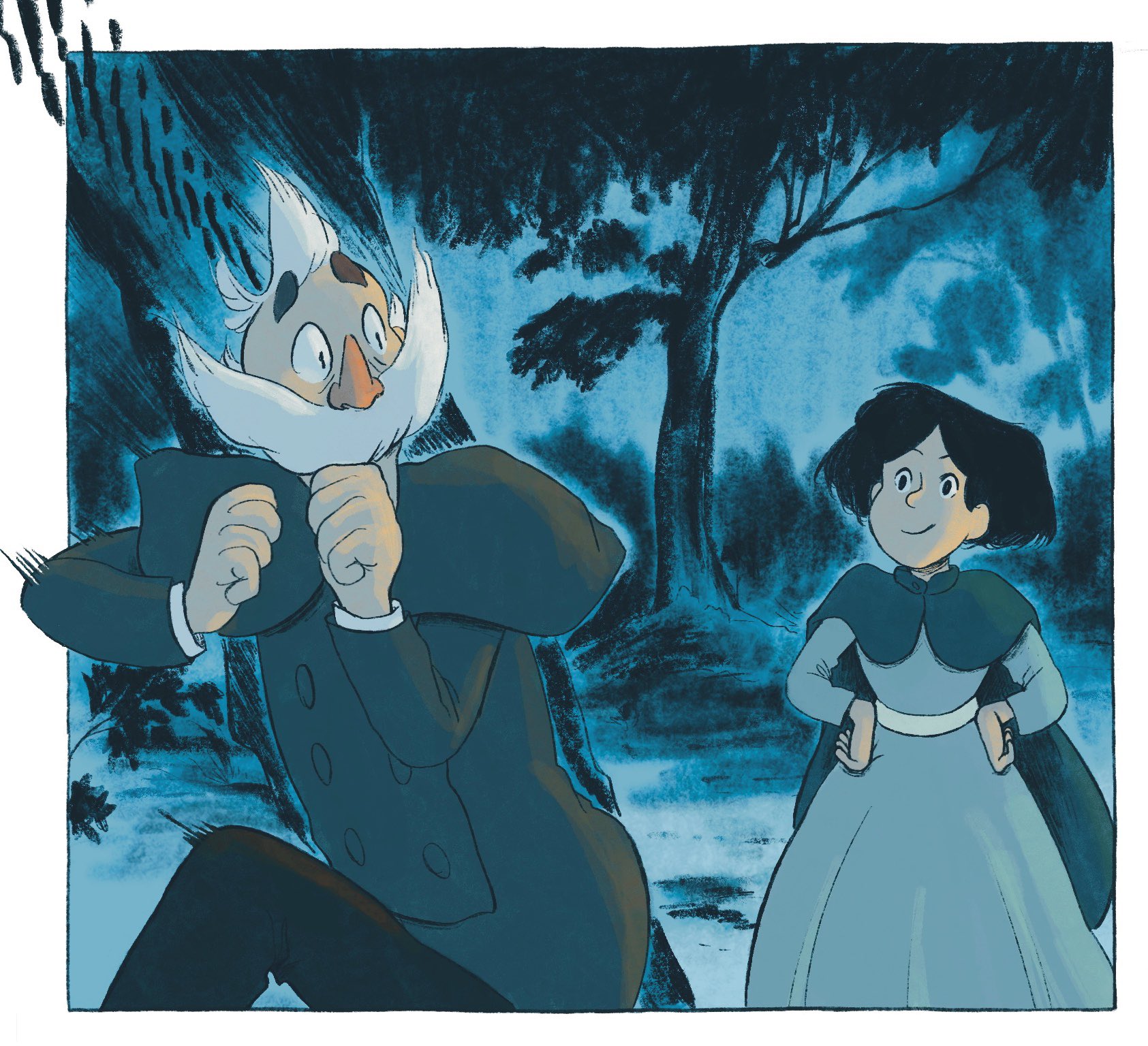 L’ambiance bonne enfant est magnifiée par le très joli dessin d’Ewen Blain. Le trait de l’auteur de Naoto est d’une grande douceur et les couleurs oranger et bleutés très belles. En choisissant une période fin XIXe / début de XXe siècle, cela rend l’histoire charmante et un peu gothique.