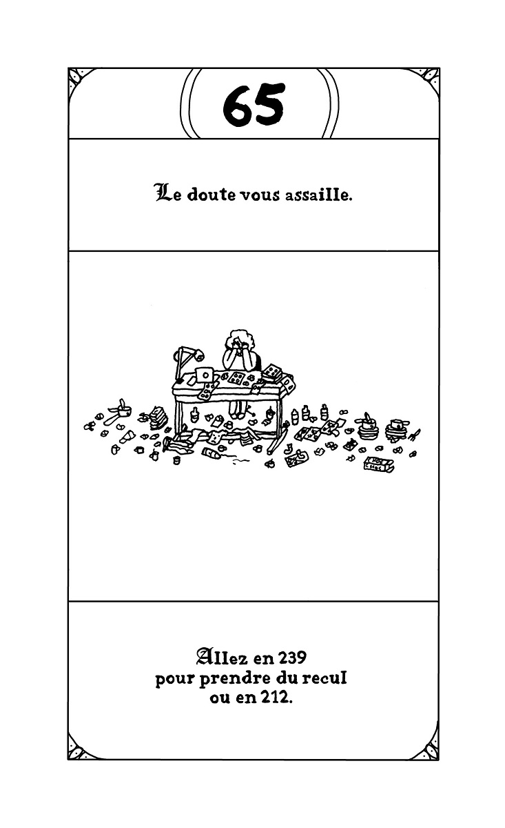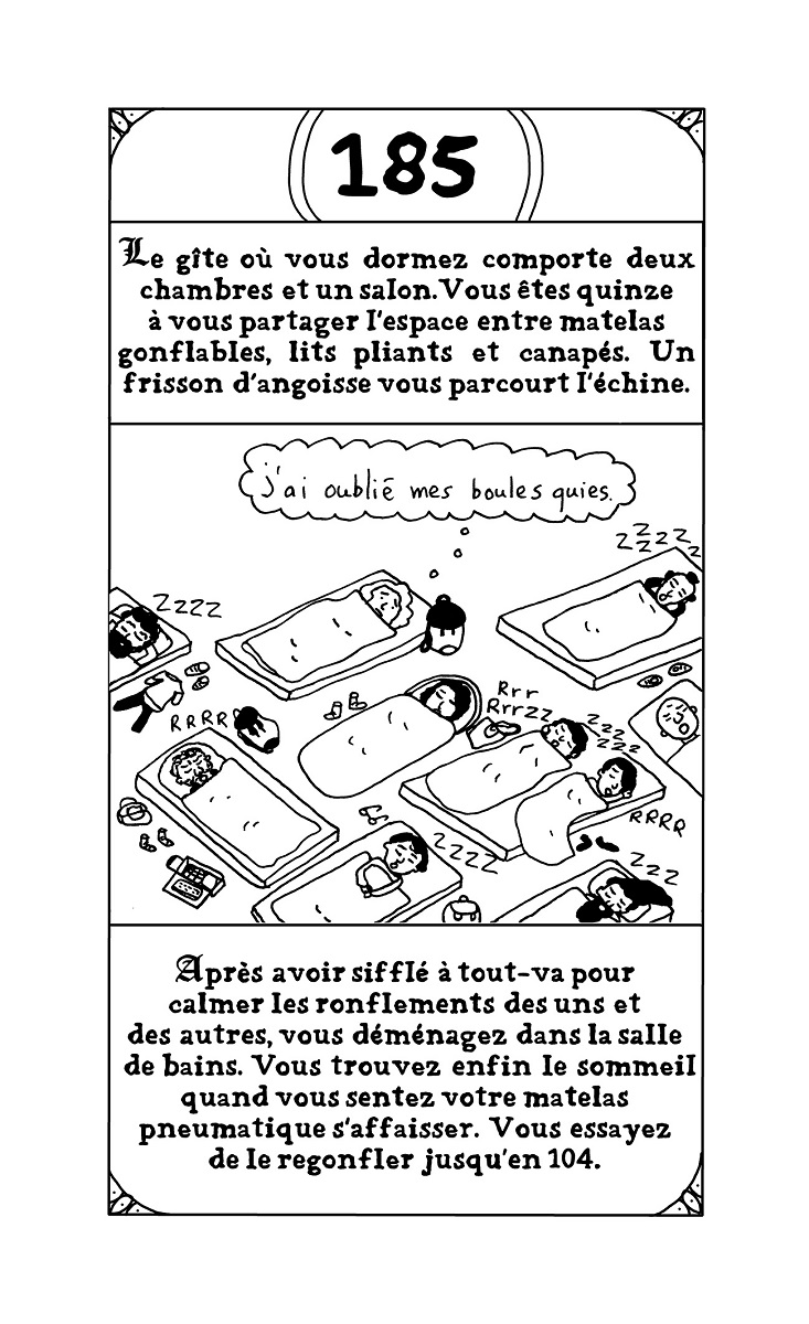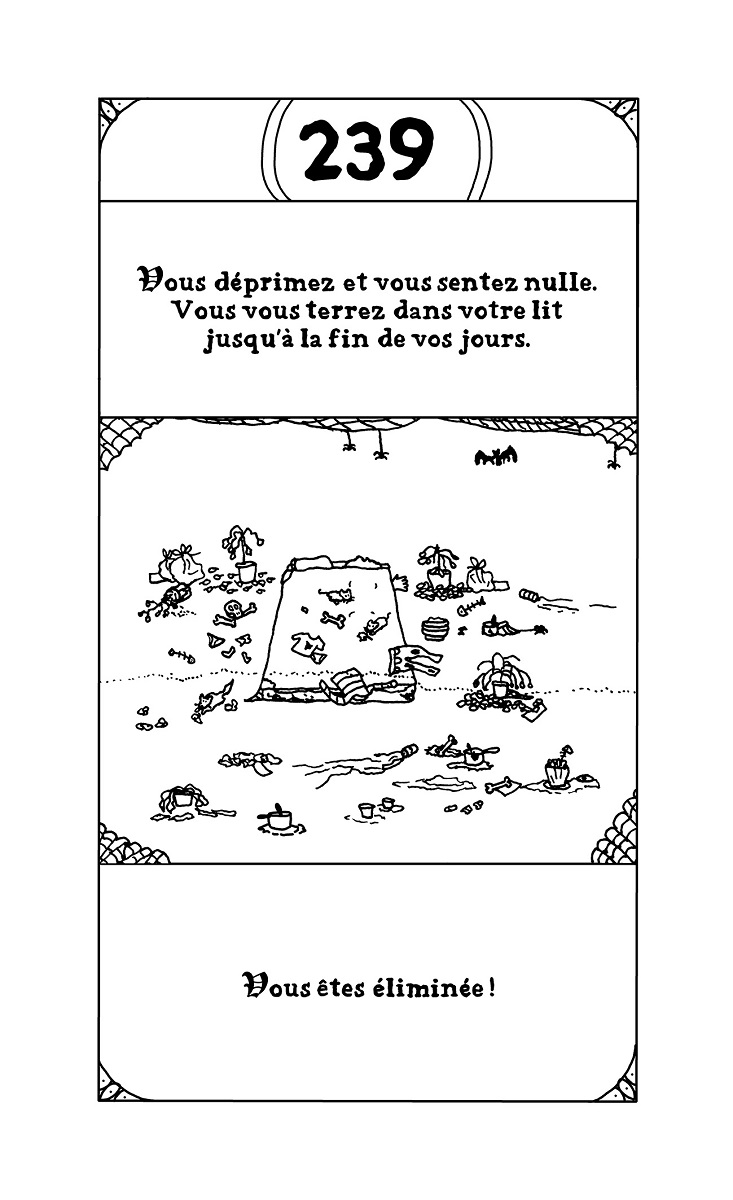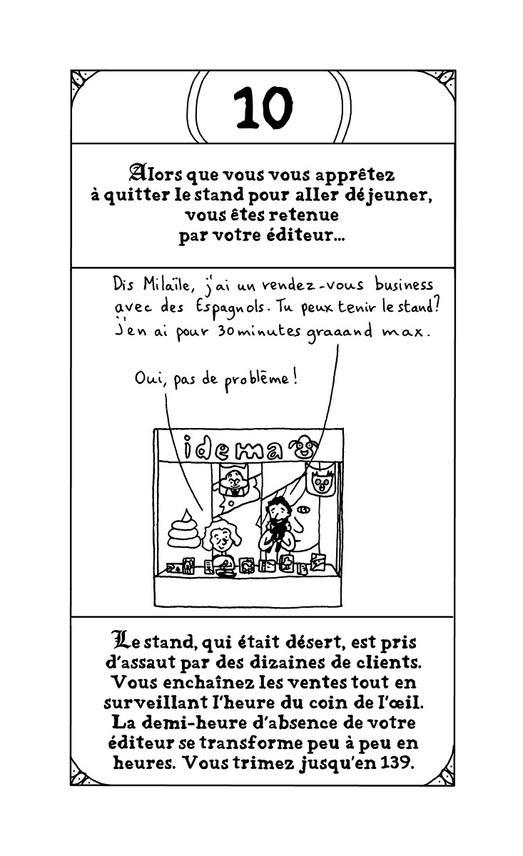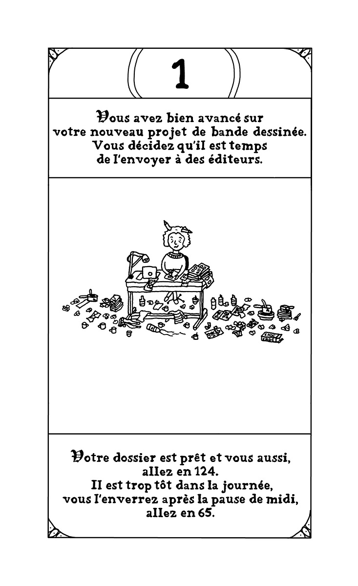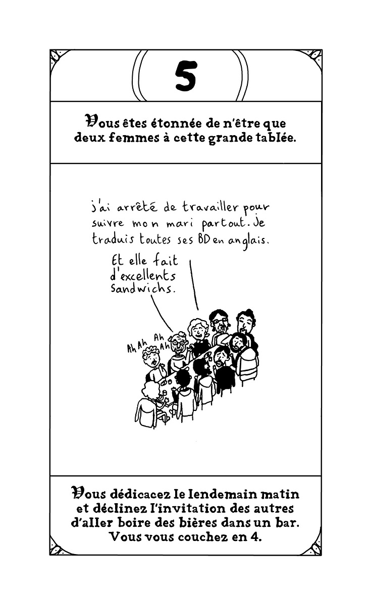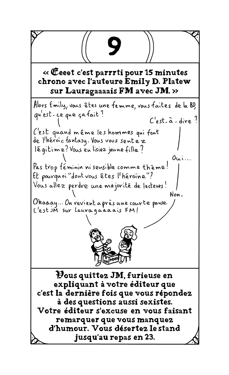 Résumé de l’éditeur : Vous avez toujours rêvé de vivre l’aventure, la vraie, avec un grand A ? Vous voulez du frisson, de l’adrénaline ? Qu’à cela ne tienne, on va vous en donner ! Laissez au vestiaire vos slips en peau de bêtes, vos casques à cornes et autres armures en fer ridicules. Vous n’en aurez pas besoin là-bas. Pas plus que de votre gros glaive. Dans le dangereux et terrifiant monde de la BD, vous ne pourrez comptez que sur votre crayon et votre carton à dessin pour vous défendre. Il faudra avoir le coeur solide, d’autant que pour augmenter la difficulté et corser sévèrement les épreuves, vous incarnerez non pas un auteur mais une AUTRICE. Avec L’EPOPEE INFERNALE, Emilie Plateau parodie les mythiques livres » dont vous êtes le héros » qu’on pouvait lire adolescent dans les années 90. Sauf qu’au lieu de vivre une épopée d’heroic fantasy, on va subir les mésaventures quotidiennes d’une autrice de bd. De l’envoi d’un nouveau manuscrit à des maisons d’édition à sa publication en livre, en passant par les invitations à des festivals ou à des rencontres-dédicaces en librairies, Emilie Plateau passe au peigne fin le microcosme de la bande dessinée et dénonce avec humour aussi bien la situation précaire des autrices et auteurs en général que le combat de longue haleine des femmes dans un milieu encore bien trop souvent sexiste et misogyne. Les lectrices et les lecteurs devront faire des choix cruciaux pour progresser dans cette quête interactive et déjouer les pièges d’un parcours semé d’embûches. Et qui sait ? Peut-être à la fin remporteront-iels le Saint Graal convoité par tant d’autrices et auteurs de bande dessinée : le Fauve d’or à Angoulême !