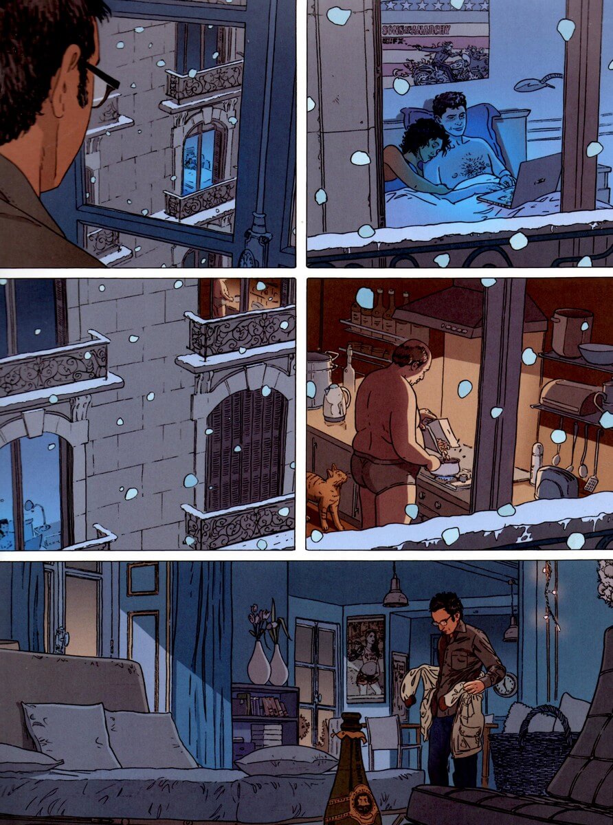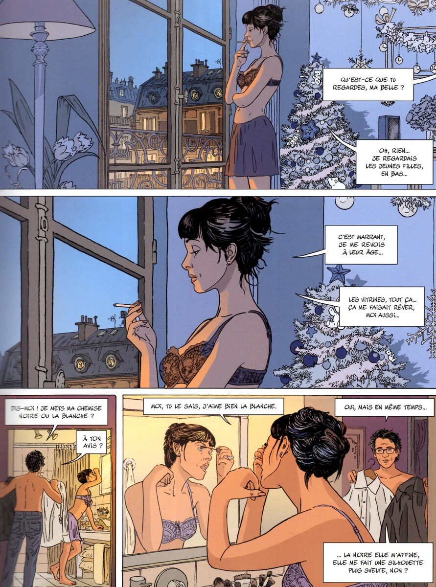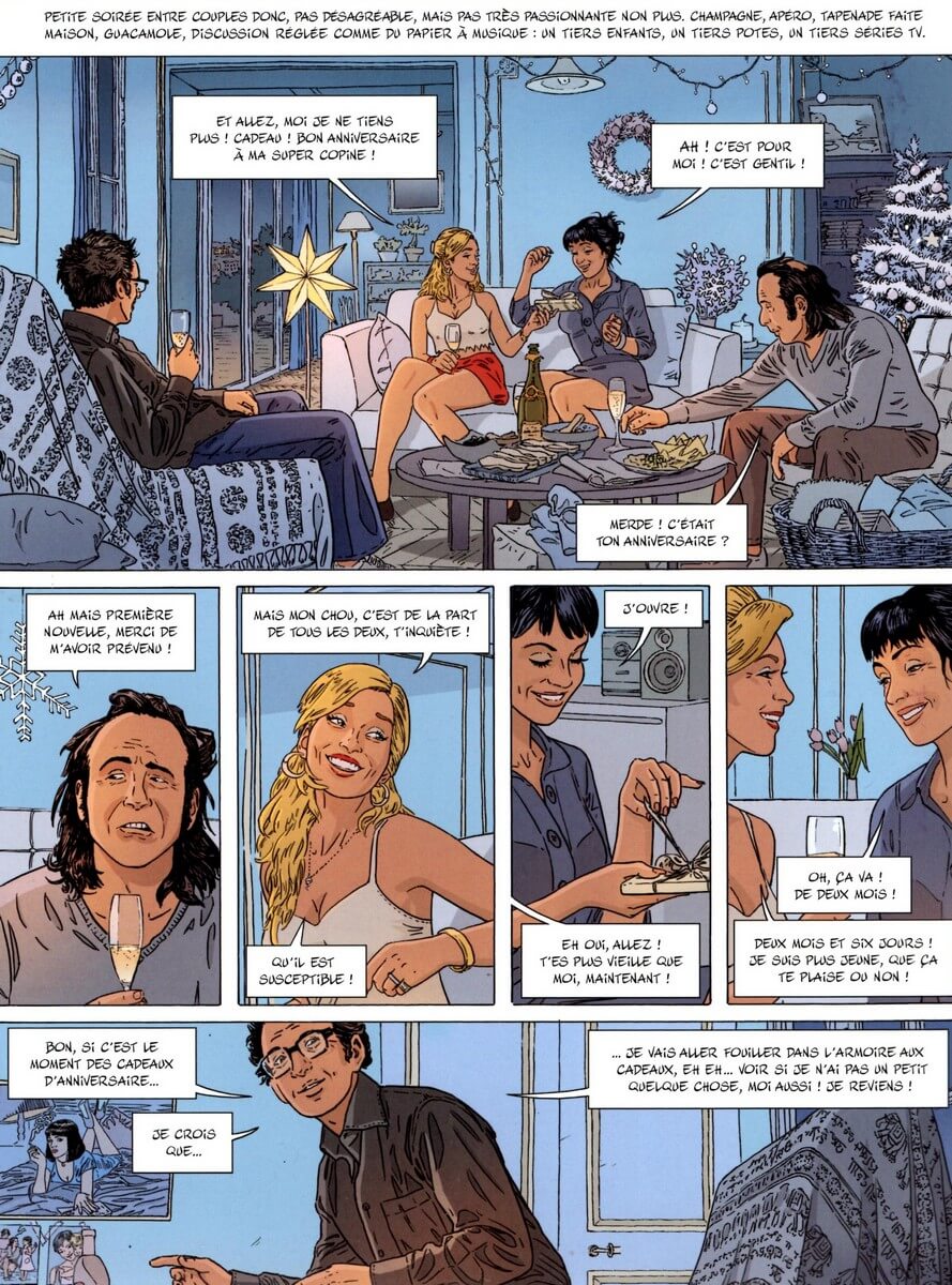 Il faut tout autant souligner le travail de Delphine à la colorisation. On ne met pas assez souvent en lumière (c’est un comble) le travail du coloriste mais le rendu pour cet album est particulièrement adapté aux diverses ambiances ressenties. Nous connaissions déjà l’attirance qu’a la compagne de Jim pour le bleu. On pourrait facilement associer cette couleur à la fameuse pilule… Mais elle aime surtout l’utiliser pour identifier les séquences nocturnes. Sans oublier l’ingénieuse idée de l’auteur d’intégrer un sapin avec sa guirlande électrique. Celle-ci permet à Delphine de jouer sur des reflets au moment où les ampoules s’allument. De sorte qu’elle puisse mettre en évidence certaines attitudes importantes. C’est bien vu.
