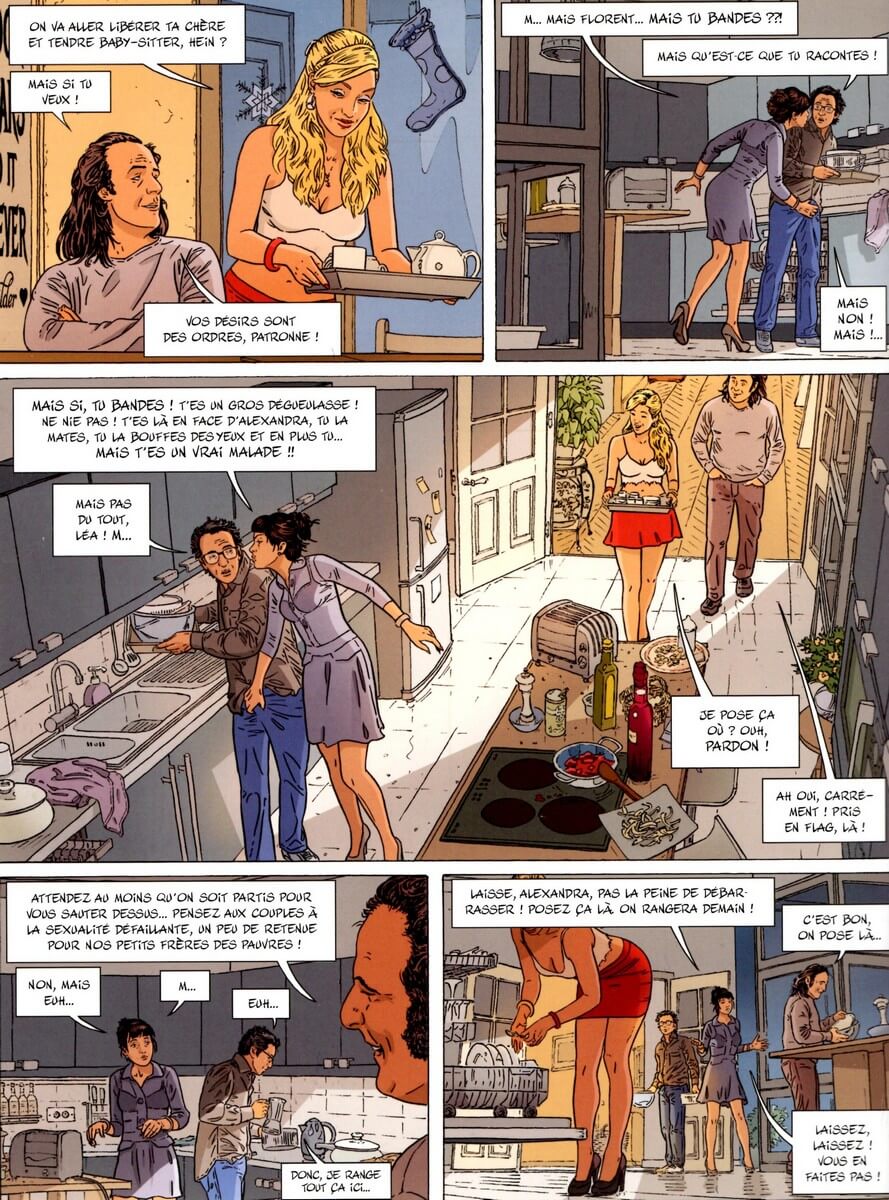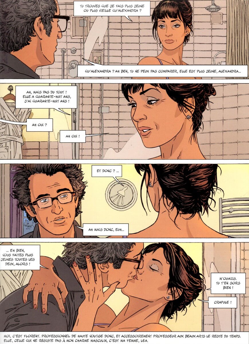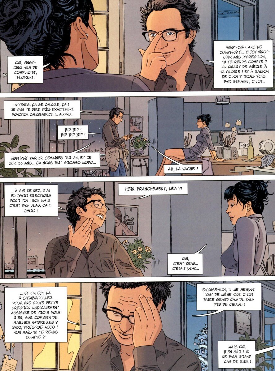 Si Jim avait choisi un autre titre que L’Érection pour ce nouveau diptyque, « La Dureté » aurait été tout aussi idoine. Tant celle des mots, des comportements, des réactions et d’un organe sont légion dans le contenu de ce premier tome. Alors pourquoi utiliser ce terme assez évocateur voire risqué ? Parce que le scénariste fait de cette érection, le délit phare dont les conséquences seront tumultueuses au sein de ce couple parisien. C’est donc l’histoire de Léa, Florent et du cadeau qu’il a imaginé pour son anniversaire…