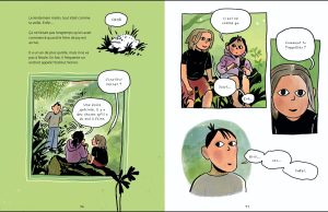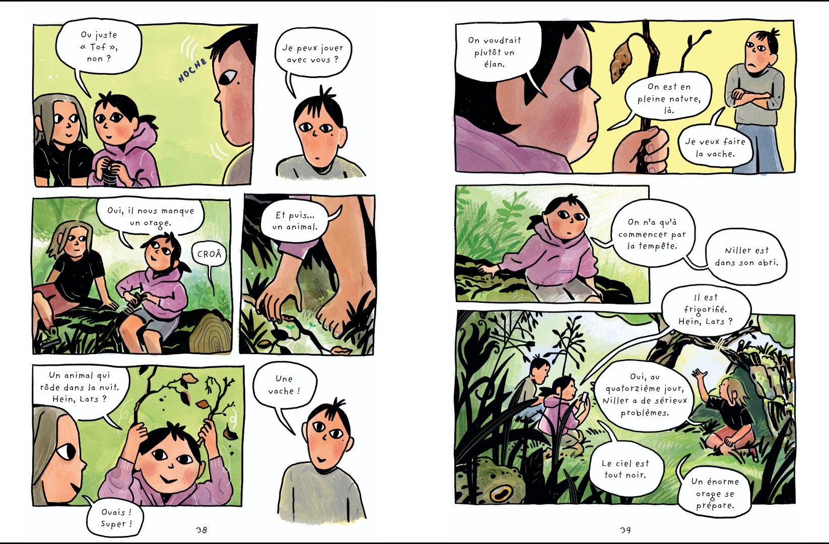 L’autrice copenhaguoise rehausse ses belles planches par de grands aplats de couleurs. On apprécie également les pages dans le jardin/jungle de Joy et Tof. Des scènes dans une nature verdoyante et accueillante.