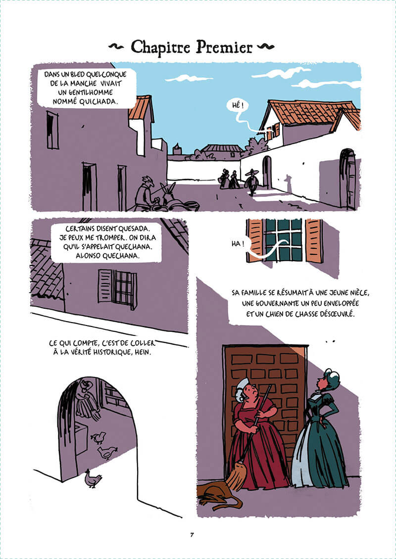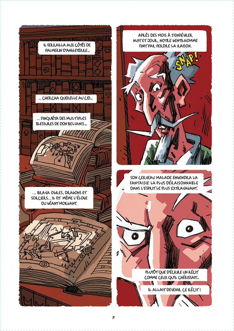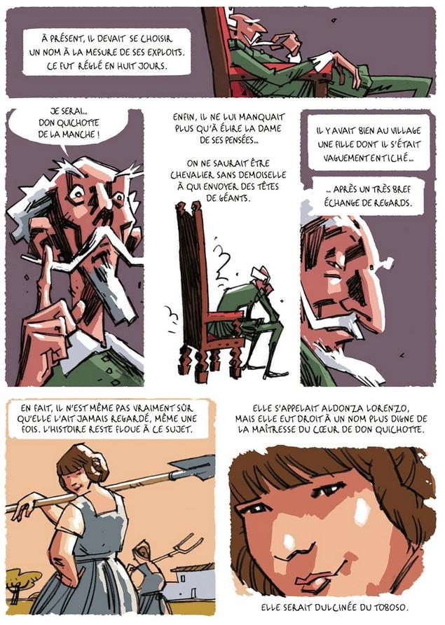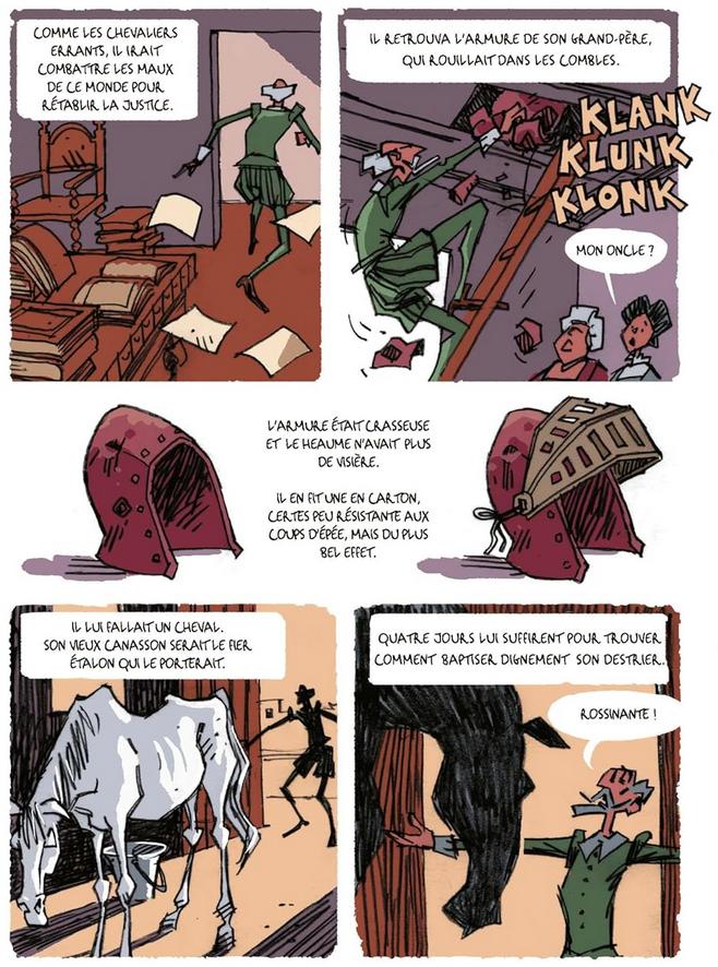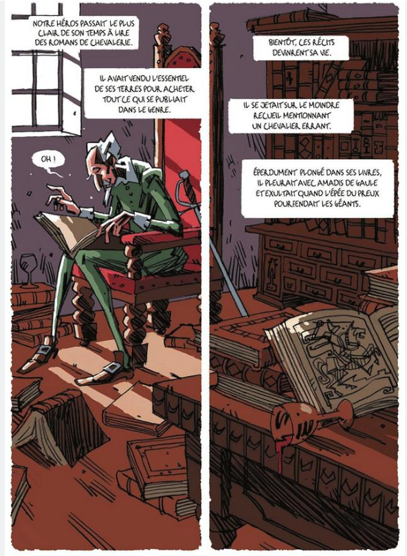 Avec son dessin frôlant la caricature, voire le cartoon, ses couleurs chaudes et chatoyantes, ses cases qui se répondent d’une page à l’autre, l’illustrateur replace cette histoire dans une modernité qui n’a rien d’anachronique. Quatre siècles après sa parution, Don Quichotte est encore bien vivant ! Ce roman graphique conséquent ( 288 pages) tient son lecteur en haleine de bout en bout. Il offre ainsi l’opportunité de lire ou de relire Don Quichotte, une œuvre résolument moderne.