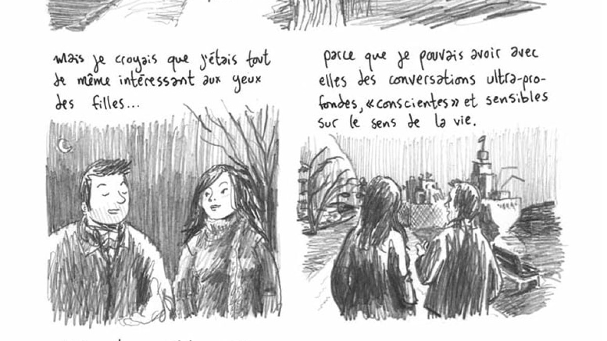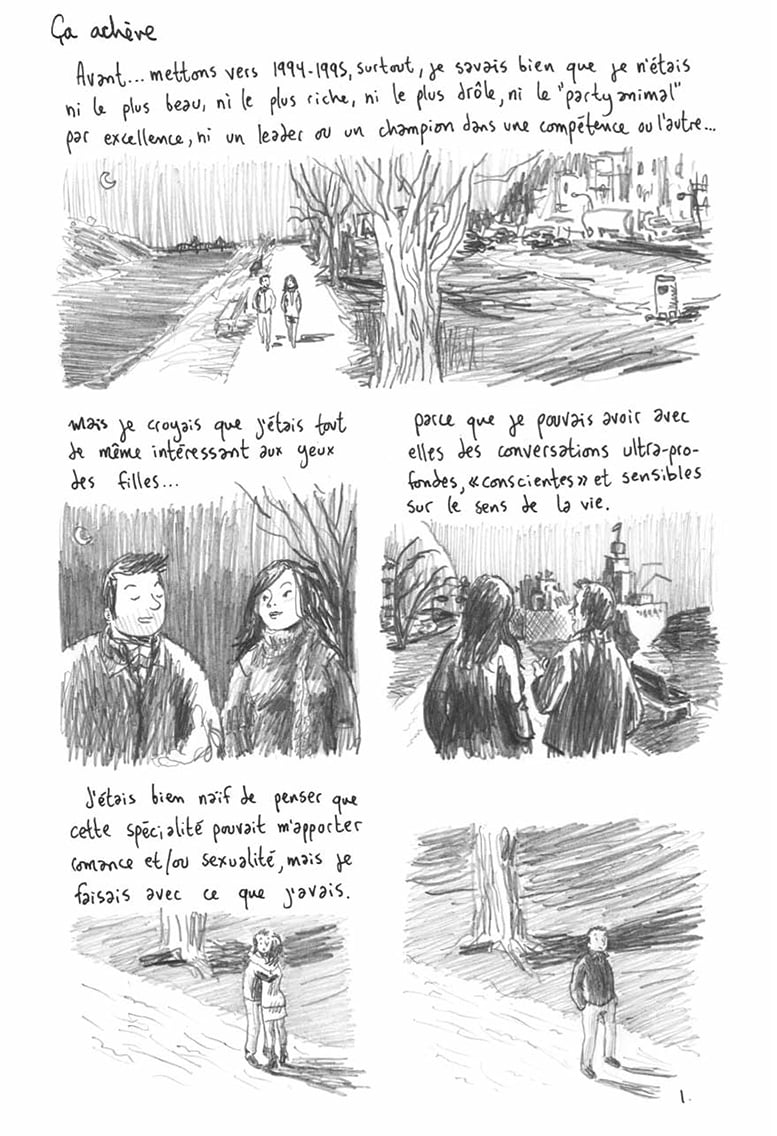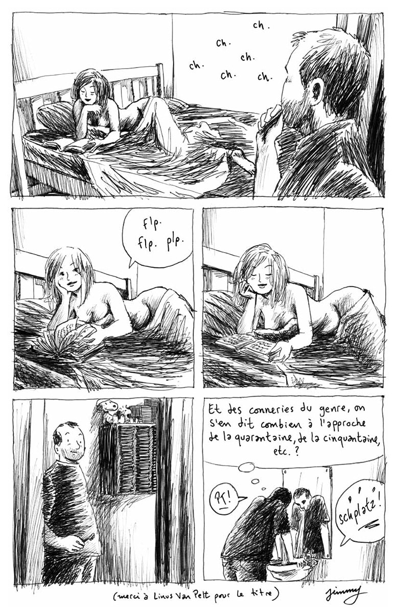 En ce moment, beaucoup d’auteurs publient leurs tranches de vie, leurs déboires et leurs réussites sur leur blog, parfois repris en album et souvent cela n’est pas très bon. En dehors du Journal de Fabrice Néaud (Ego comme X) ou le brillant Sainte Famille de Xavier Mussat (Ego comme X), très bonnes autobiographies, l’album de Jimmy Beaulieu est bien loin de ces ouvrages-blogs. Ses récits parleront à cette génération de trentenaires-quadragénaires : conscience politique qui s’affirme, un célibat forcé, les grands doutes et les questionnements sur leur vie sentimentale et professionnelle ou encore les relations familiales (les repas, les deuils, les maladies, la vieillesse, le temps qui passe avec les restaurants qui ferment autour de son appartement, les cousinades…), le tout, entrecoupés de scènes d’enfance et d’adolescence et des premiers émois amoureux en croisant de belles filles.
