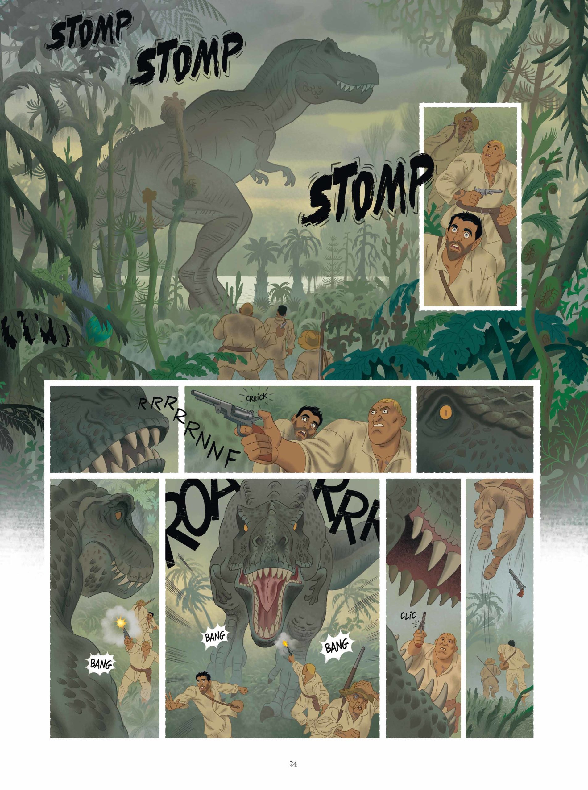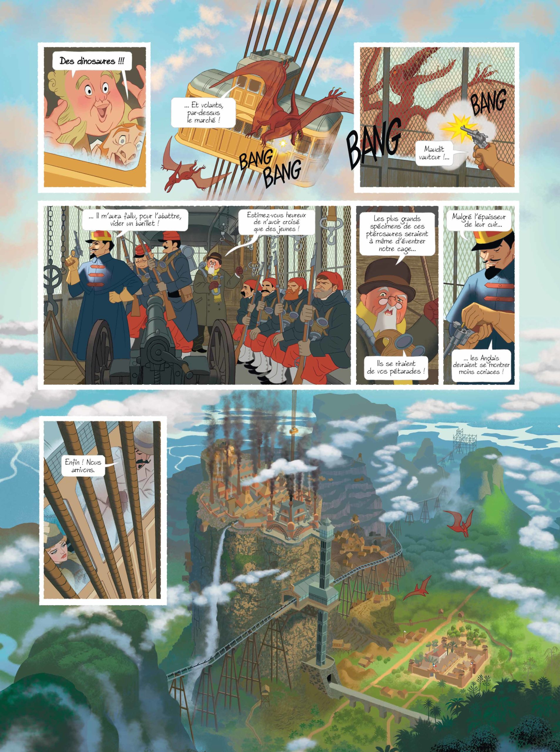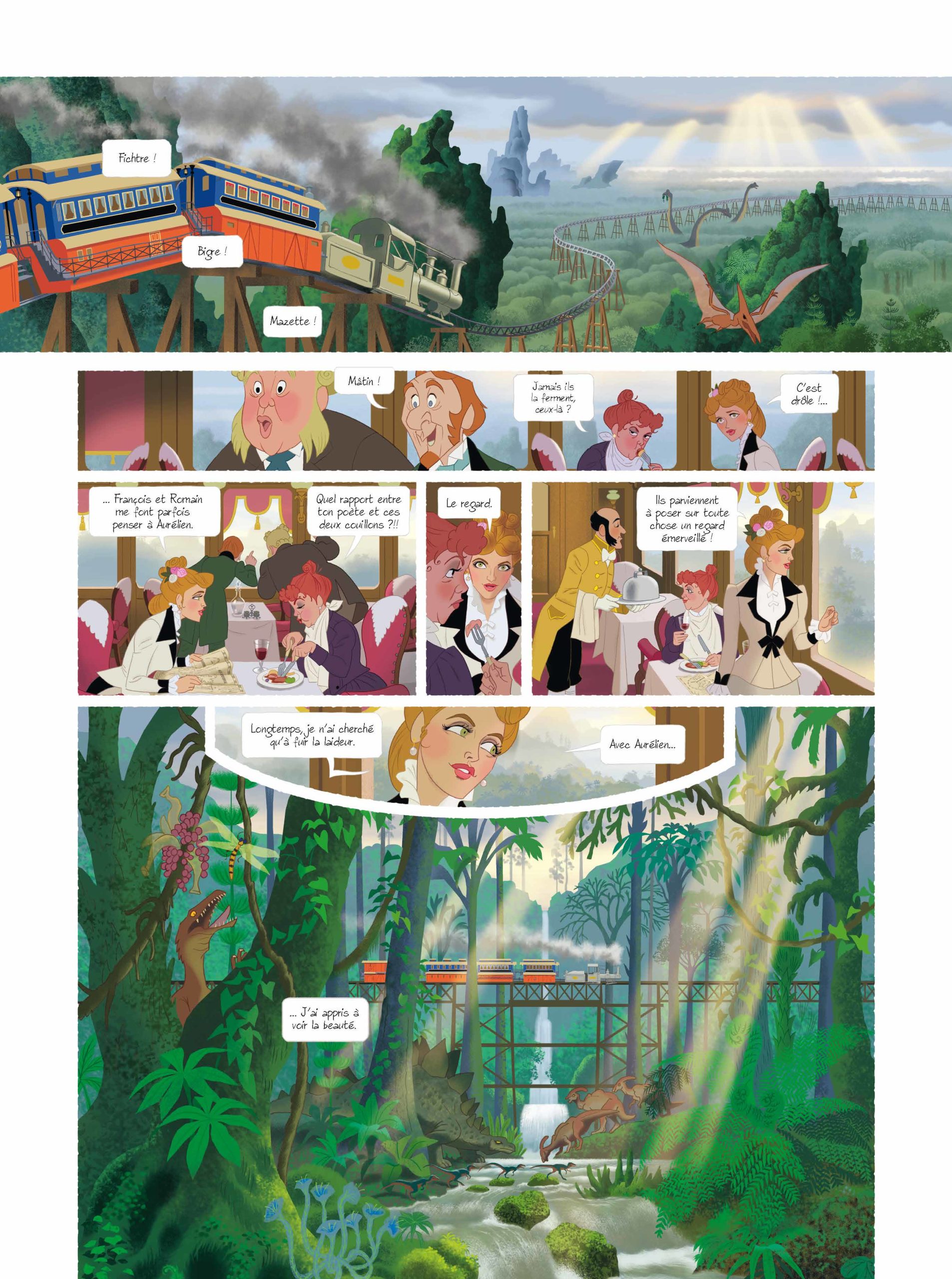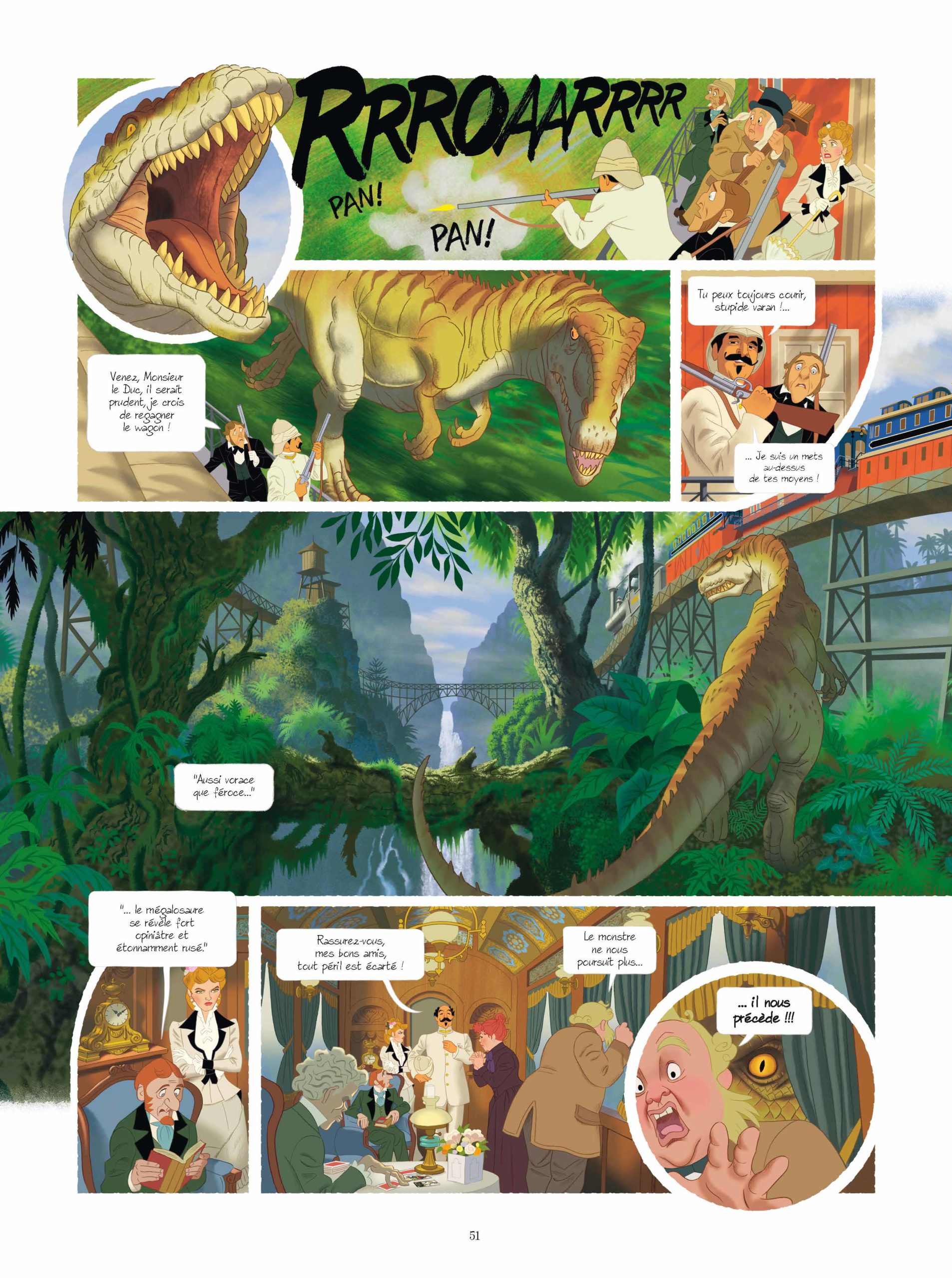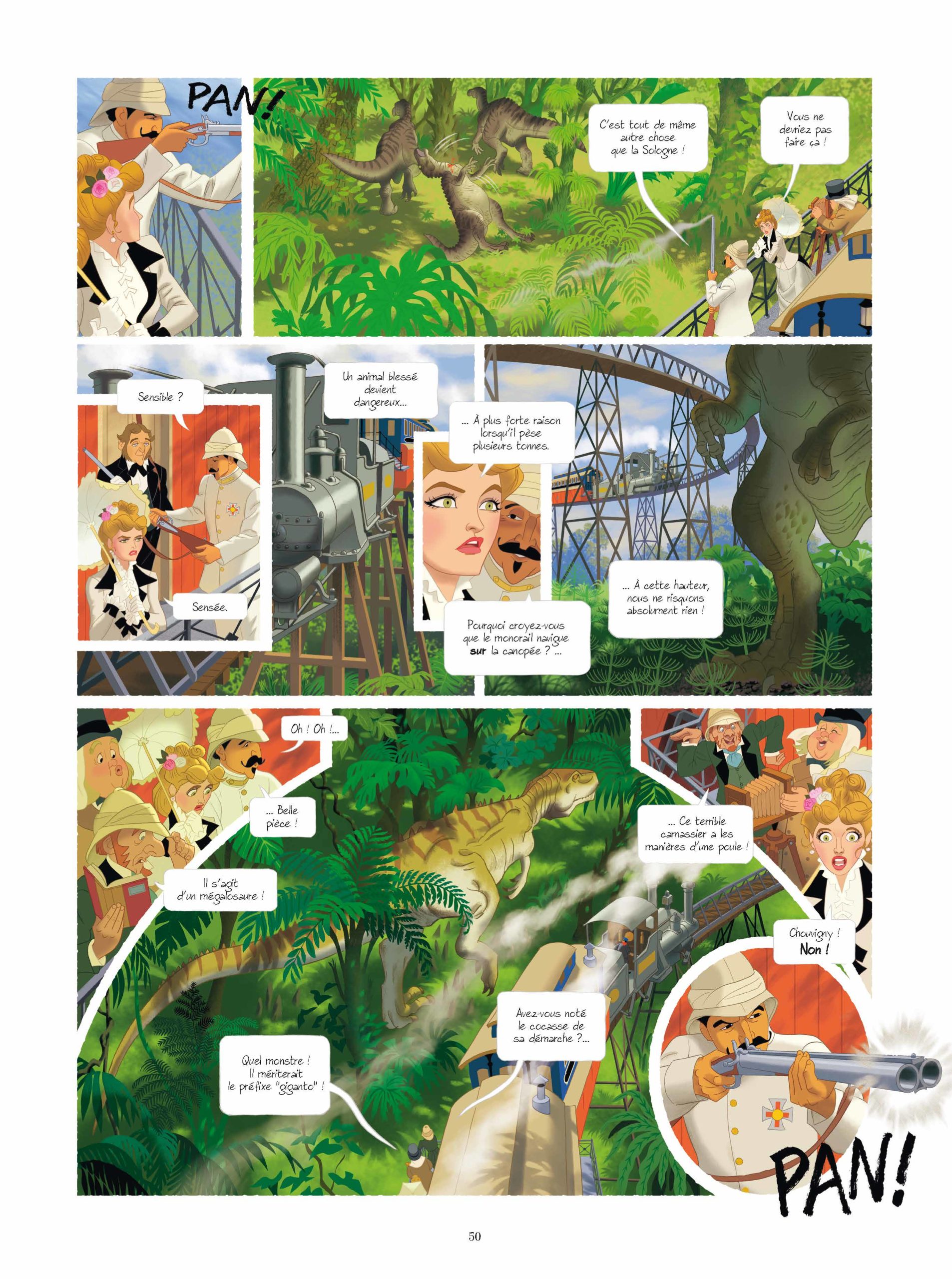 Son dessin numérique, proche de celui de la gouache, lui permet de nous offrir des scènes particulièrement lumineuses et détaillées. Cela me fait penser à un dessin animé de qualité. C’est coloré, vivant et très lisible. Que ce soit dans les scènes d’intérieures fastueuses ou dans les scènes d’action au milieu des dinos, Etienne Jung assure.