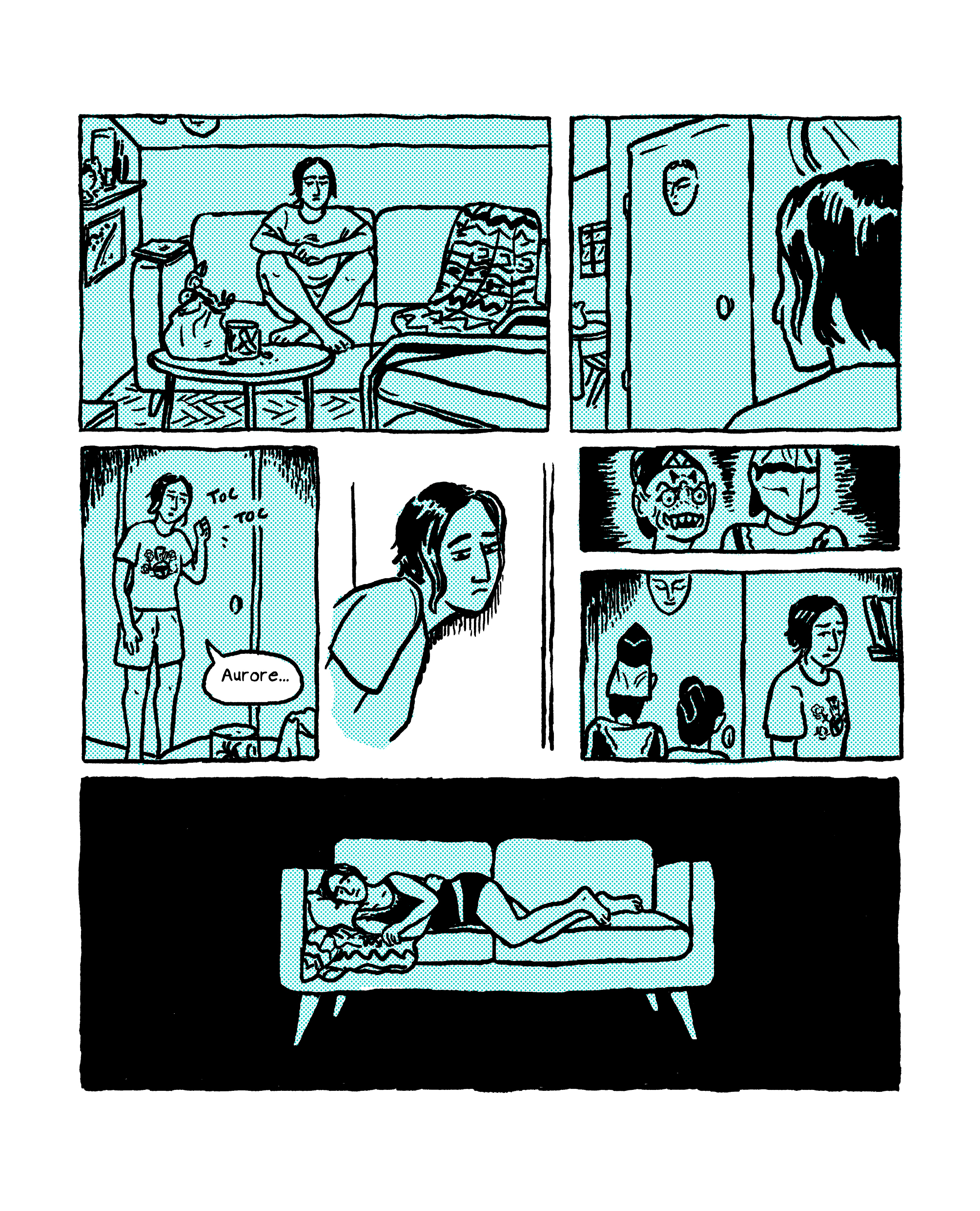 Ce que l’on peut noter d’abord, c’est la parfaite maîtrise graphique de l’artiste. Oui, son style adopte une forme de simplicité. Mais pas par défaut technique. Son dessin apporte le juste équilibre entre le réalisme nécessaire pour illustrer les situations de base de ces récits et un dessin plus conceptuel offrant une prise de distance avec le réel. Sa maîtrise de la narration nous fait évoluer en permanence entre empathie pour les personnages et prise de distance par rapport à leurs troubles. Avec des trames monochromes pour apporter de la diversité et du relief aux planches, nous avons donc une proposition graphique particulièrement riche et complexe.