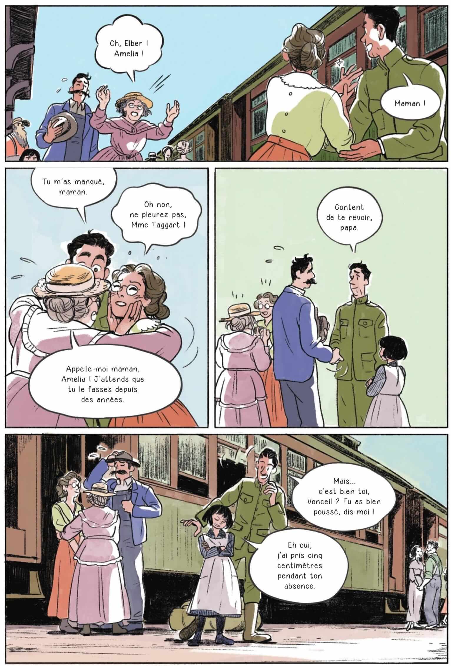 Résumé de l’éditeur : Lorsque Elber, le frère aîné de Vonceil, revient à la ferme familiale de l’Oklahoma après avoir servi sur les lignes de front de la Première Guerre mondiale, les choses ne se passent pas comme elle l’espérait. L’expérience traumatisante de la guerre l’ont transformé en homme austère et responsable qui n’a plus de temps à lui consacrer. Alors qu’il vient d’épouser la fille qu’il avait laissée derrière lui, surgit une femme en blanc mystérieuse et captivante qui accuse Elber de l’avoir abandonnée en France. Lorsqu’il refuse de quitter sa femme, elle jette un sort au puits familial, qui transforme les réserves d’eau pure de la ville en eau salée. Qui est cette dame en blanc, qu’a-t-elle fait à la ferme et que sait le vieil oncle Dell de Vonceil à son sujet ? Pour le savoir, Vonceil va devoir affronter le monde de la sorcellerie peuplé de parents dangereux, d’animaux métamorphosés, d’une capricieuse sorcière du sucre et de la Dame en blanc, la sinistre sorcière du sel. Au cours de ce voyage épique qui va la transformer, la jeune fille en apprendra beaucoup sur l’amour et sur ce que cela signifie de grandir. Les Contrées salées est un conte de fées graphique magnifiquement illustré par Rebecca Mock sur un scénario de Hope Larson, autrice de All Summer Long, nominé pour le prix Eisner, et de A Wrinkle in Time: The Graphic Novel, lauréat du prix Eisner.