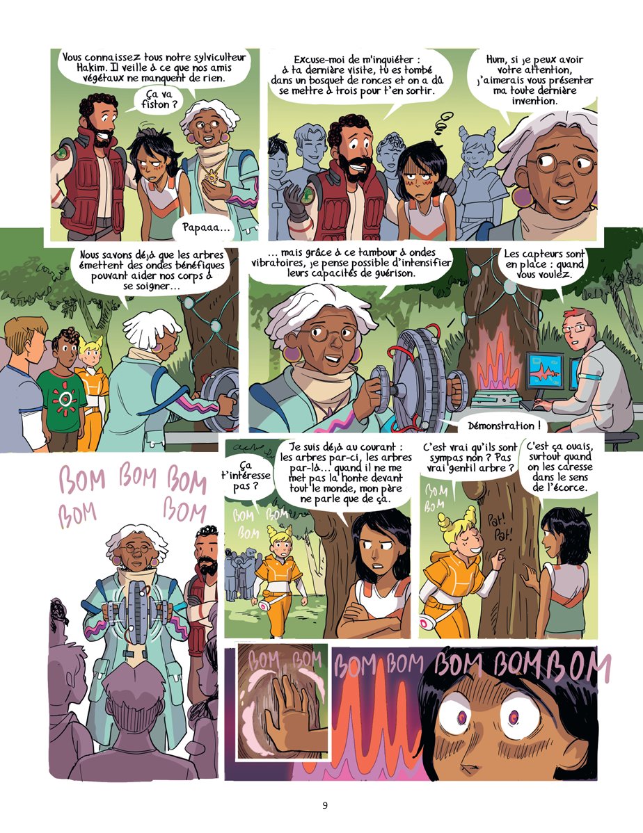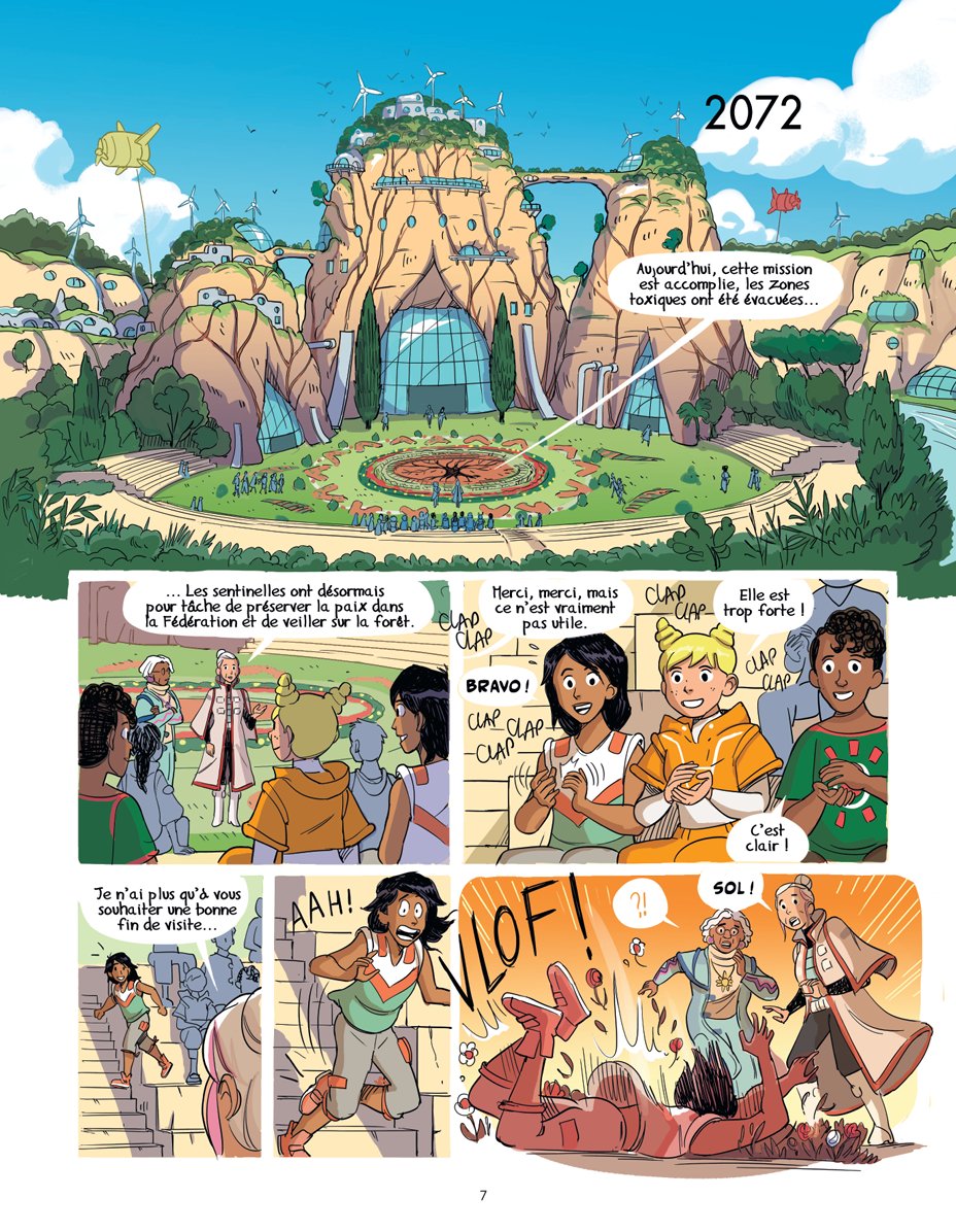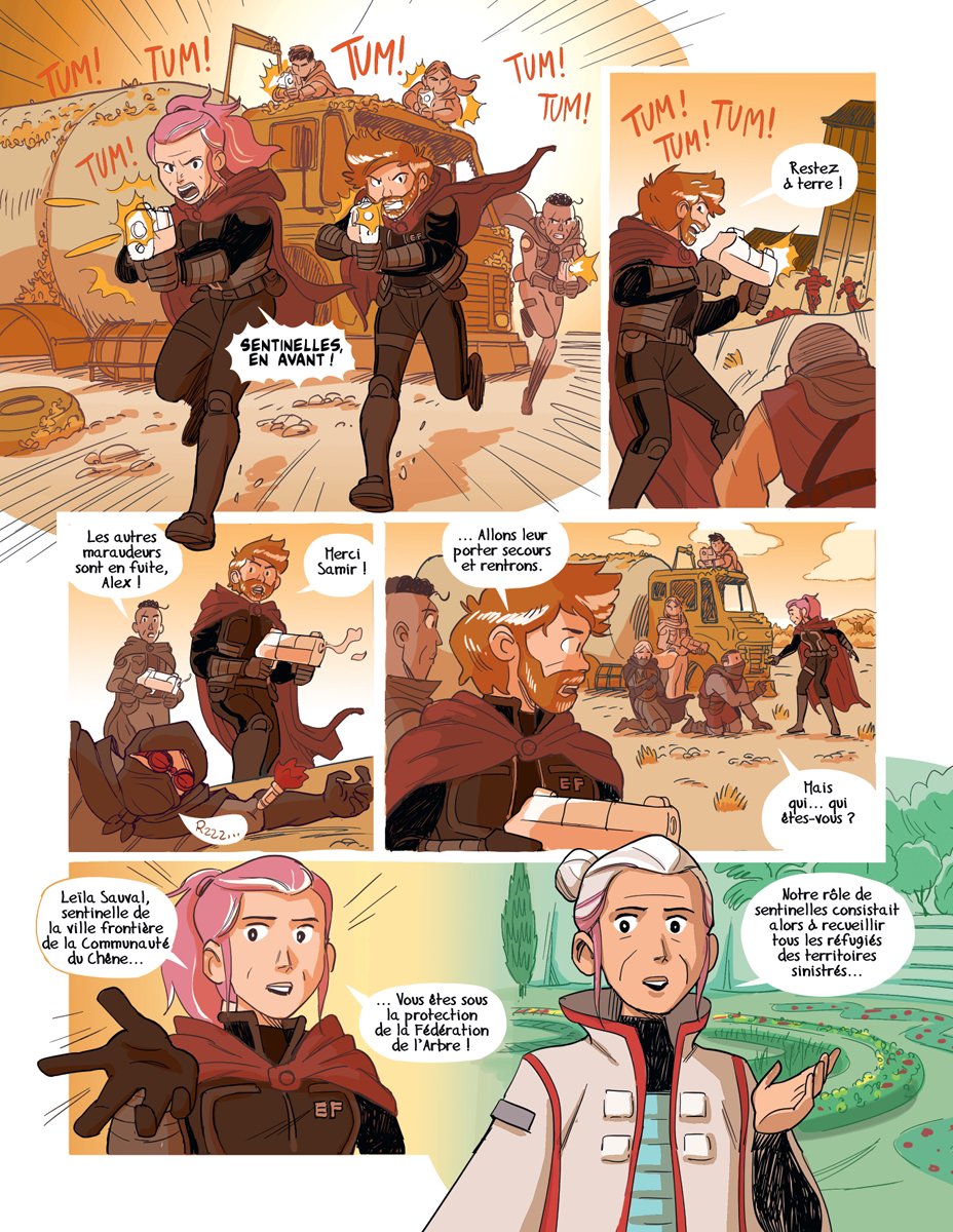 Les amateurs d’Espions de famille retrouvent ainsi Leïla en gouverneure de la Fédération. Rangée de l’action, elle gère avec justesse et bienveillance les politiques de cette entité. Elle est le lien entre l’ancienne génération – celle qui a connu notre époque contemporaine – et la nouvelle génération, sauvée des catastrophes climatiques. L’on apprécie toujours avec autant d’envie, le travail de Thierry Gaudin et Romain Ronzeau sur les liens intergénérationnels. Avec les grands-parents dans Espions de famille, avec la génération future dans Les enfants de l’arbre. Leïla symbolise les interactions intelligentes entre les deux.
