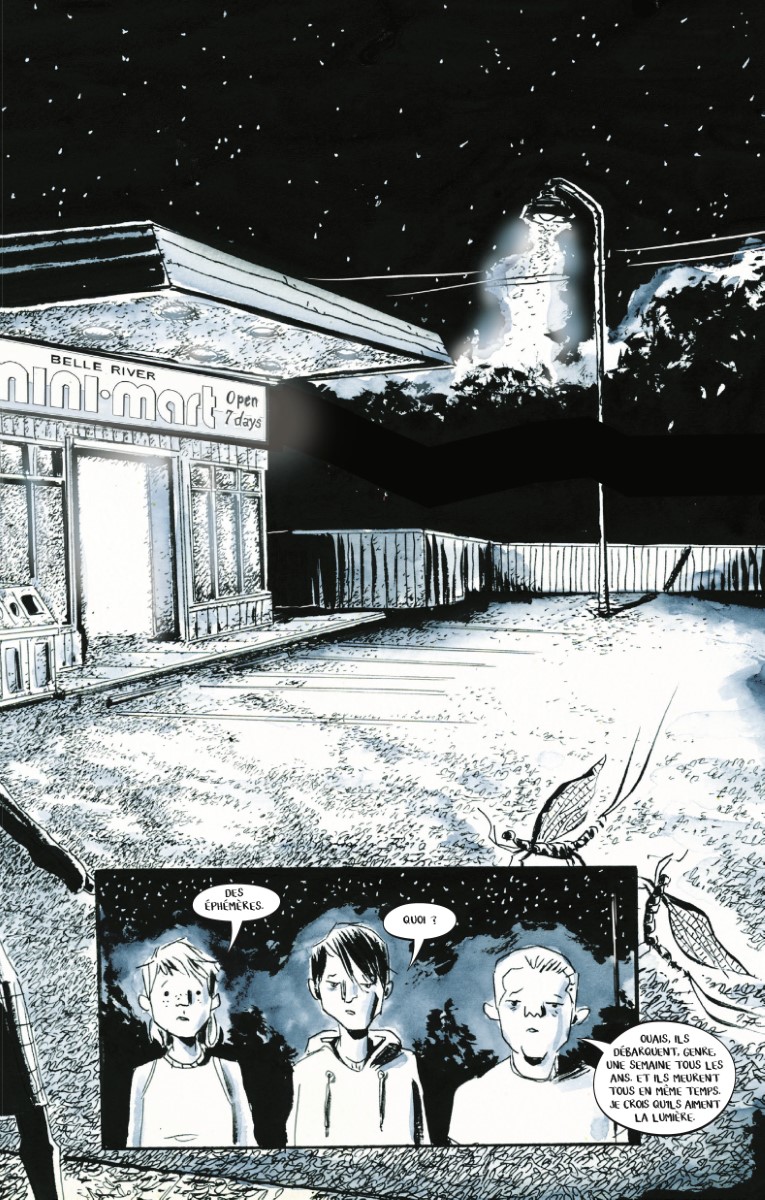 Résumé de l’éditeur : Des millions d’éphémères, une petite ville en ébullition, un meurtrier en cavale, un monstrueux insecte géant, une adolescente mal dans sa peau, des parents tyranniques ou dépassés… rien ne se passe bien à Belle River ces derniers temps. Pourtant, en dépit des meurtres qui se succèdent, dans cette atmosphère poisseuse, l’amitié entre Fran et le monstre ne faiblit pas. Rejetés de tous, ils se sont trouvés. La police poursuit son enquête. Pour l’inspecteur Danny, il est clair que Fran a été enlevée par le meurtrier. Mais de nouveaux témoignages laissent apparaitre que cette situation a déjà eu lieu des années auparavant. Pire, elle serait même ancrée dans l’histoire de la petite bourgade… Après le succès du Labyrinthe inachevé, Jeff Lemire, au sommet de son art, revient sur ses terres de prédilection, la campagne canadienne, l’enfance et le fantastique.