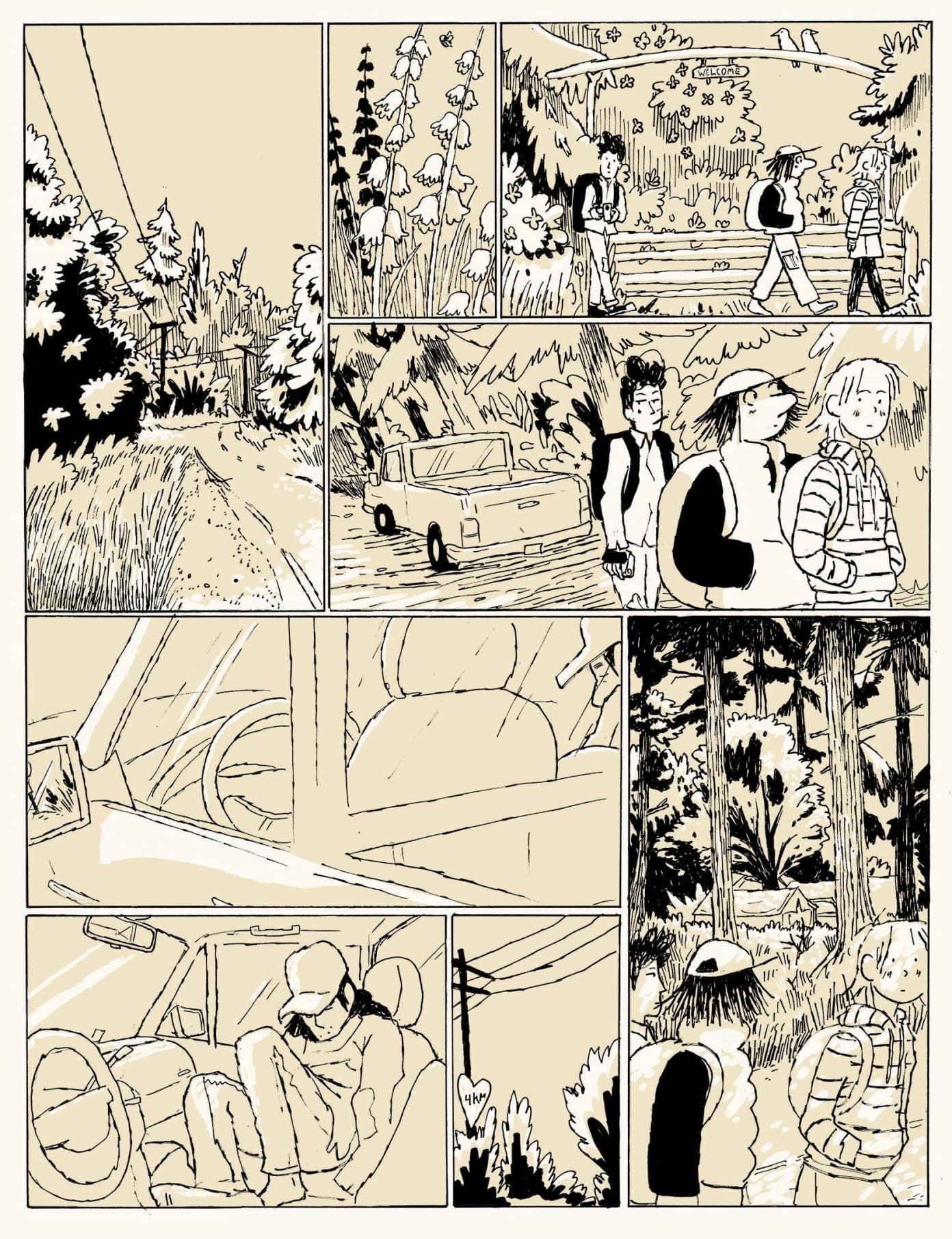 Si le but est Evergreen, une communauté utopiste autonome agricole, le périple est bien plus important que la destination dans Les herbes sauvages. Adam de Souza – dont c’est la première bande dessinée – imagine avant tout un road-movie de teenagers sensible et intelligent. Le cheminement physique et intellectuel est donc plus important que la ferme autogérée.