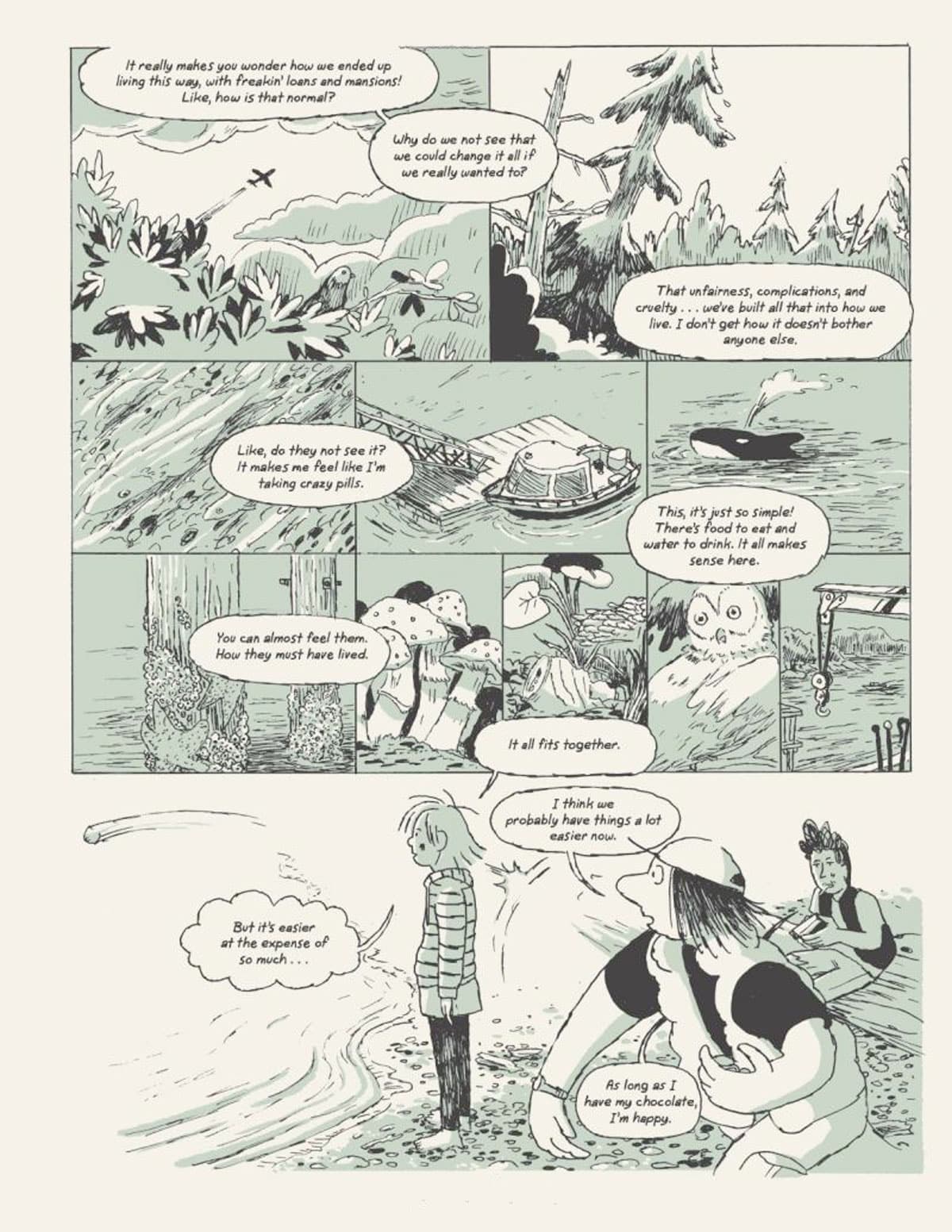 Les trois ami.es montent alors à bord d’un ferry, direction Evergreen. Mais le chemin est long jusqu’à la communauté. Un trajet semé d’embûches…