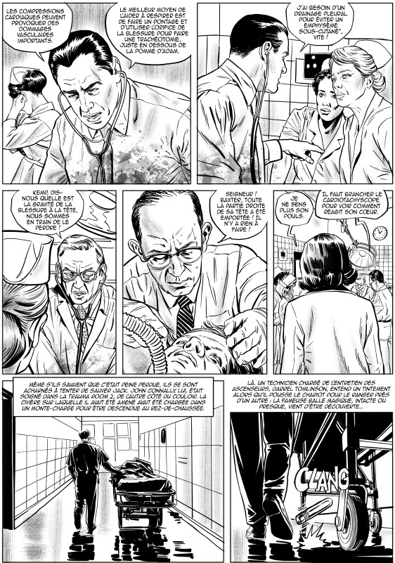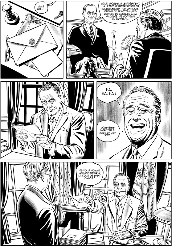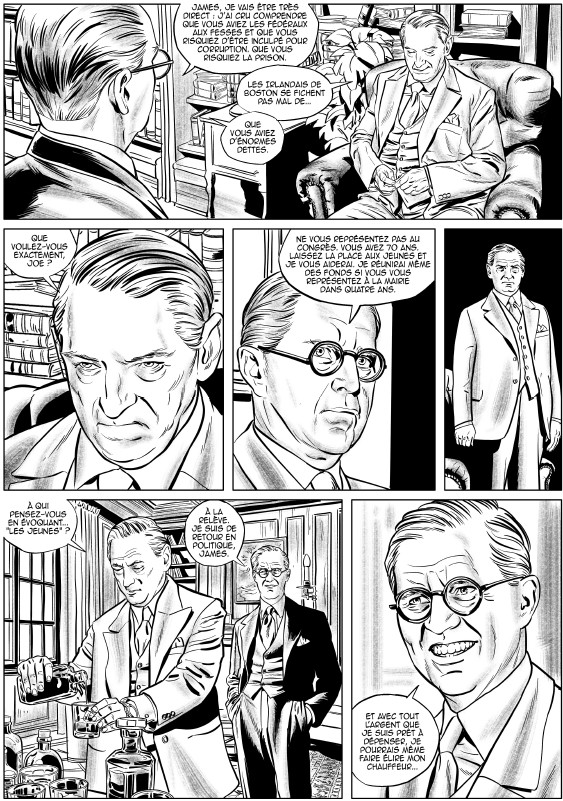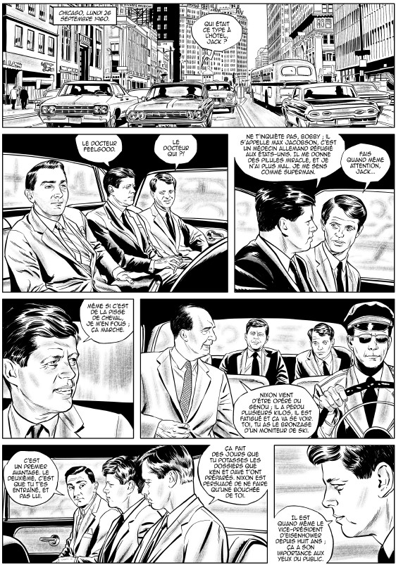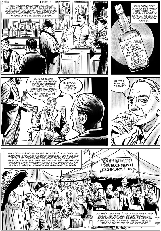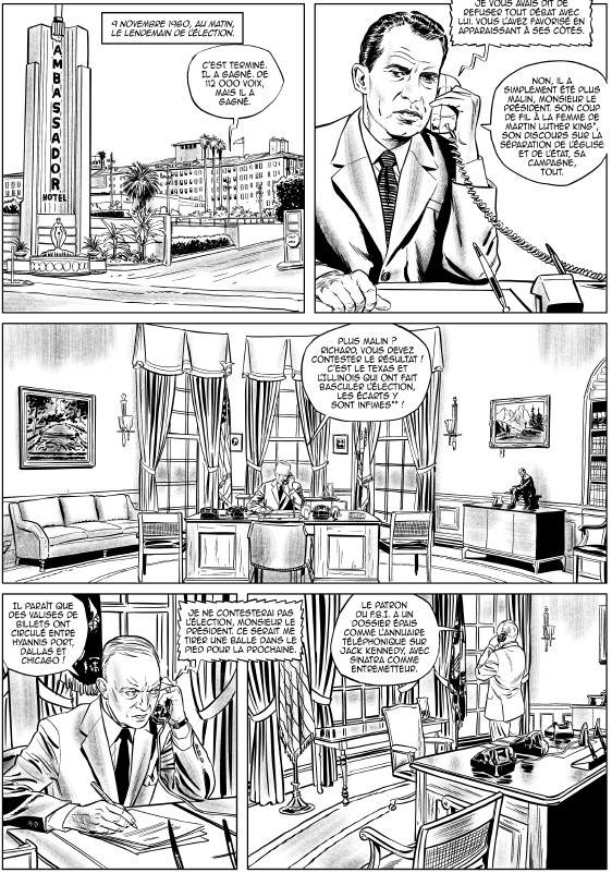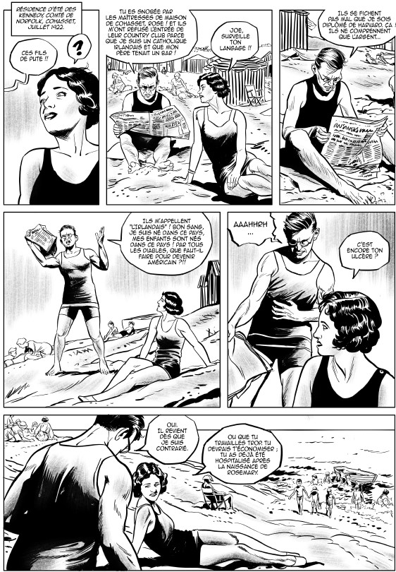 Pour illustrer le scénario très dense de Philippe Pelaez, quoi de mieux que ce choix judicieux de la sobriété avec un dessin en noir et blanc. Comme pour donner encore plus de réalisme à l’incroyable galerie de personnages du récit. Ainsi qu’à des faits datant du 19e et du 20e siècle, quand ils étaient racontés par les journaux ou visionnés à télévision encore en noir et blanc. Bernard Khattou réussit parfaitement à nous plonger visuellement dans cette époque et dans ces plus de 100 années pendant lesquelles la famille Kennedy aura connu une irrésistible et irrépressible ascension économique, sociale et politique. Mais surtout des fins dramatiques pour ses principaux membres.