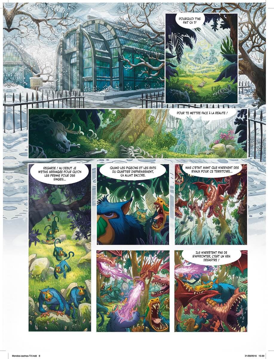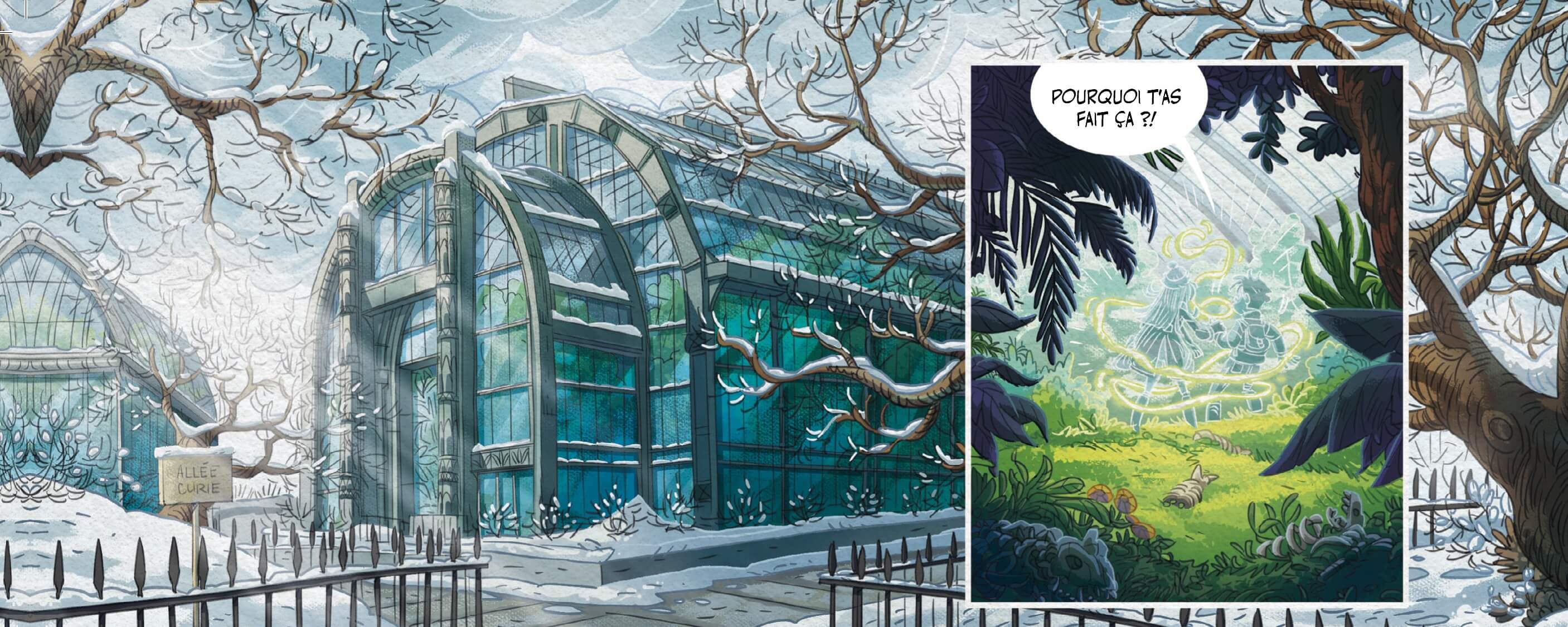 Le gros point fort de La confrérie secrète est la partie graphique de Silvio Camboni. Accompagné aux couleurs par Joëlle Comtois, l’auteur italien nous en met encore plein la vue. Ses planches sont sublimes ! Son découpage très cinématographique (il a travaillé pour les Studios Disney) donne énormément de mouvement et de vie à ses cases. Ses pages fourmillent de détails notamment dans les décors de l’habitation de Emeline, ceux de la serre ou ceux du musée.