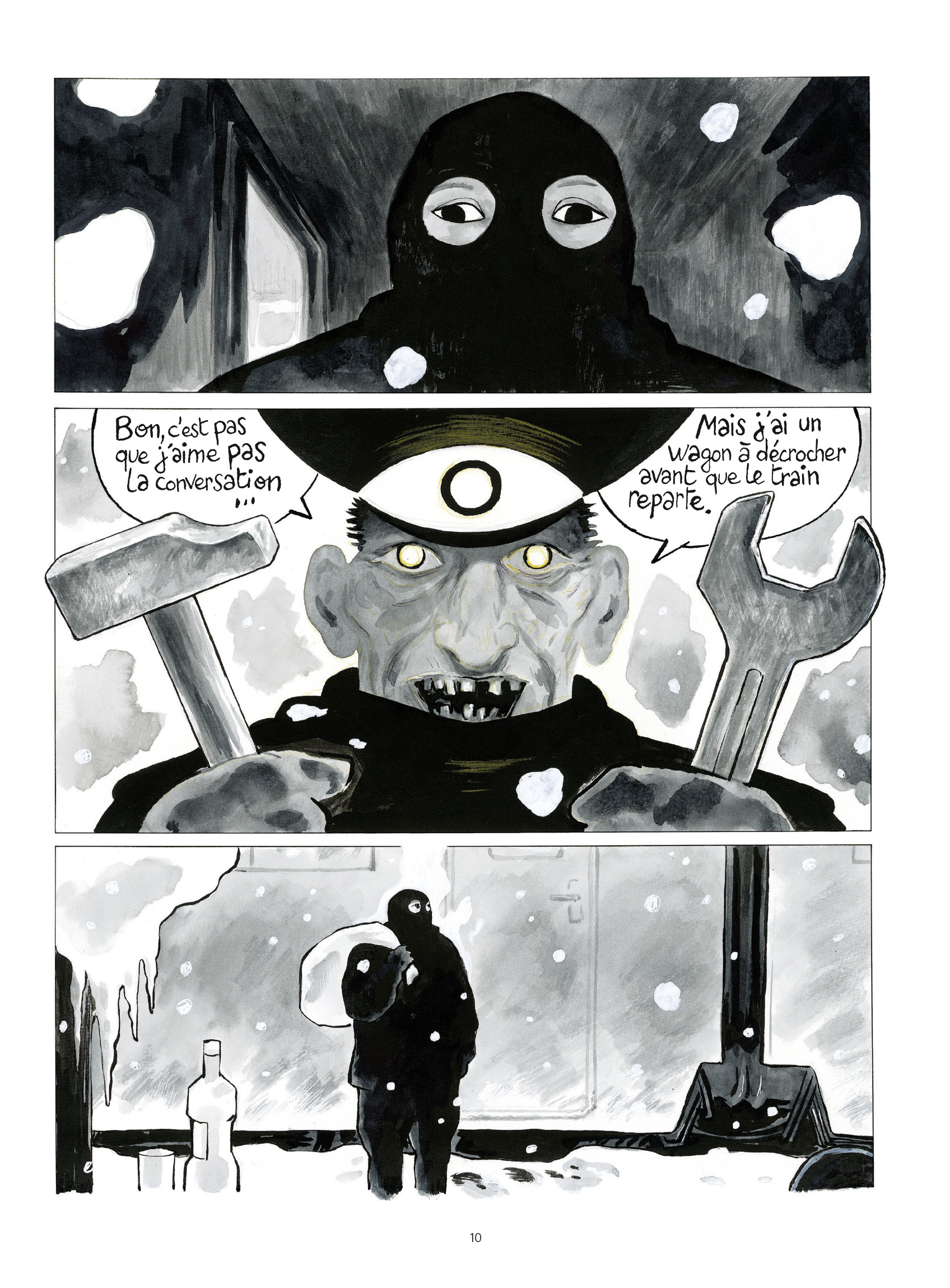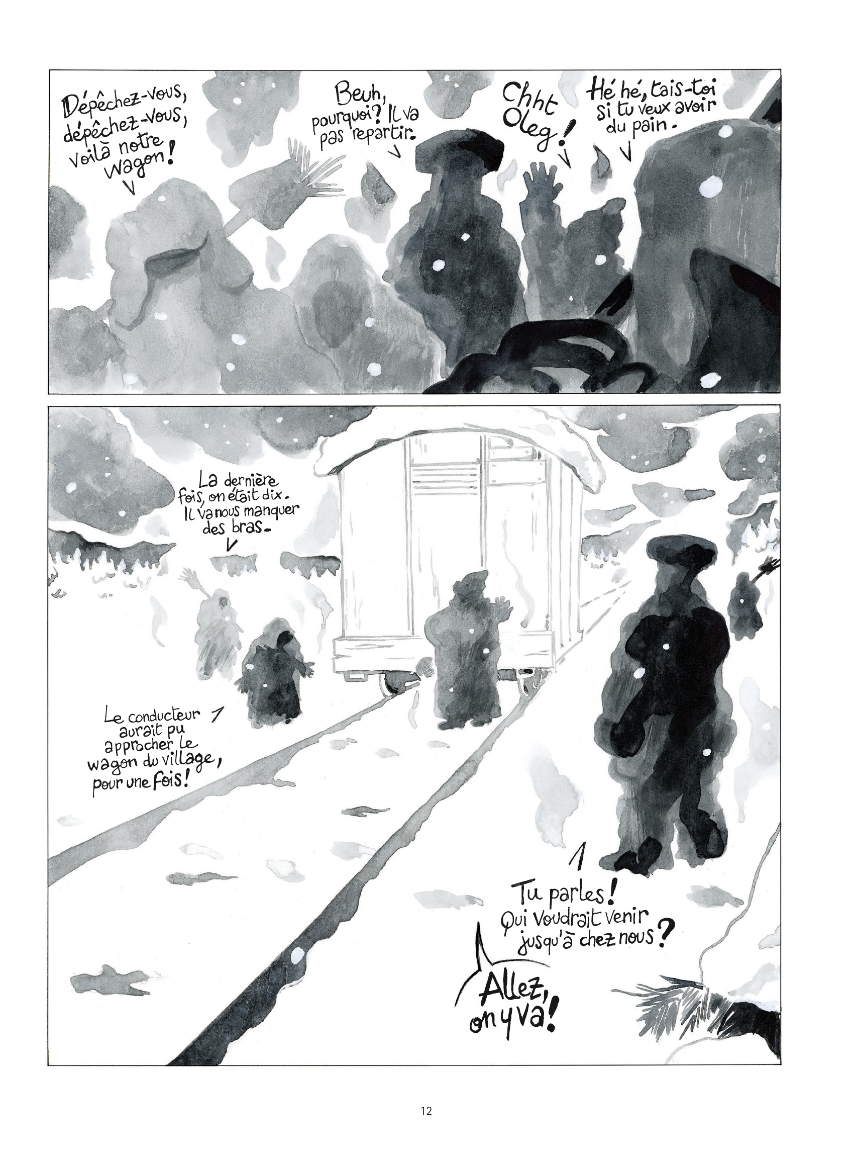Résumé de l’album: Dans une ambiance étouffée par la neige, les habitants d’un petit village au fin fond de la campagne russe se pressent autour d’un wagon de chemin de fer, apportant victuailles. Mais pas que cela. En descend également Dima, un jeune soldat ayant combattu en Tchétchénie, déclaré décédé par l’armée. Son retour bouleverse la vie de sa famille, sa grand-mère, son frère, les villageois… Dima est hanté par les horreurs qu’il a connu durant la guerre. Il n’est plus le même, peut-être déjà mort dans sa tête, en sursis pour les autres. Seules sa grand-mère et Sveta, une jeune fille amoureuse, lui rêvent un avenir radieux. Au loin, les montagnes dorées annoncent le printemps, le renouveau. Pour combien de temps ?