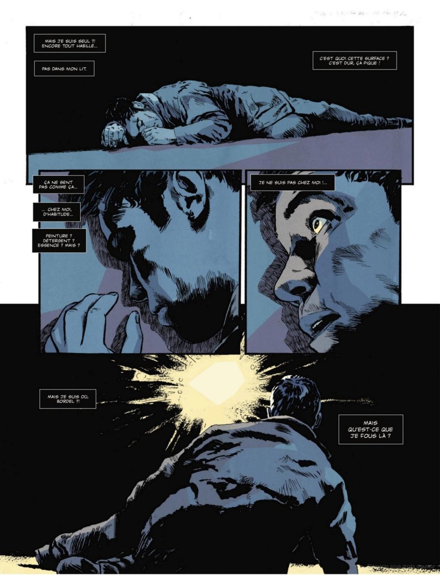 « Impression étrange. Comme une gueule de bois, un lendemain de cuite. Sauf qu’il peine à se souvenir de la veille…Neurones en vrac. Enfin ses yeux s’ouvrent complètement. Il réalise qu’il gît par terre, à même un béton sale… »