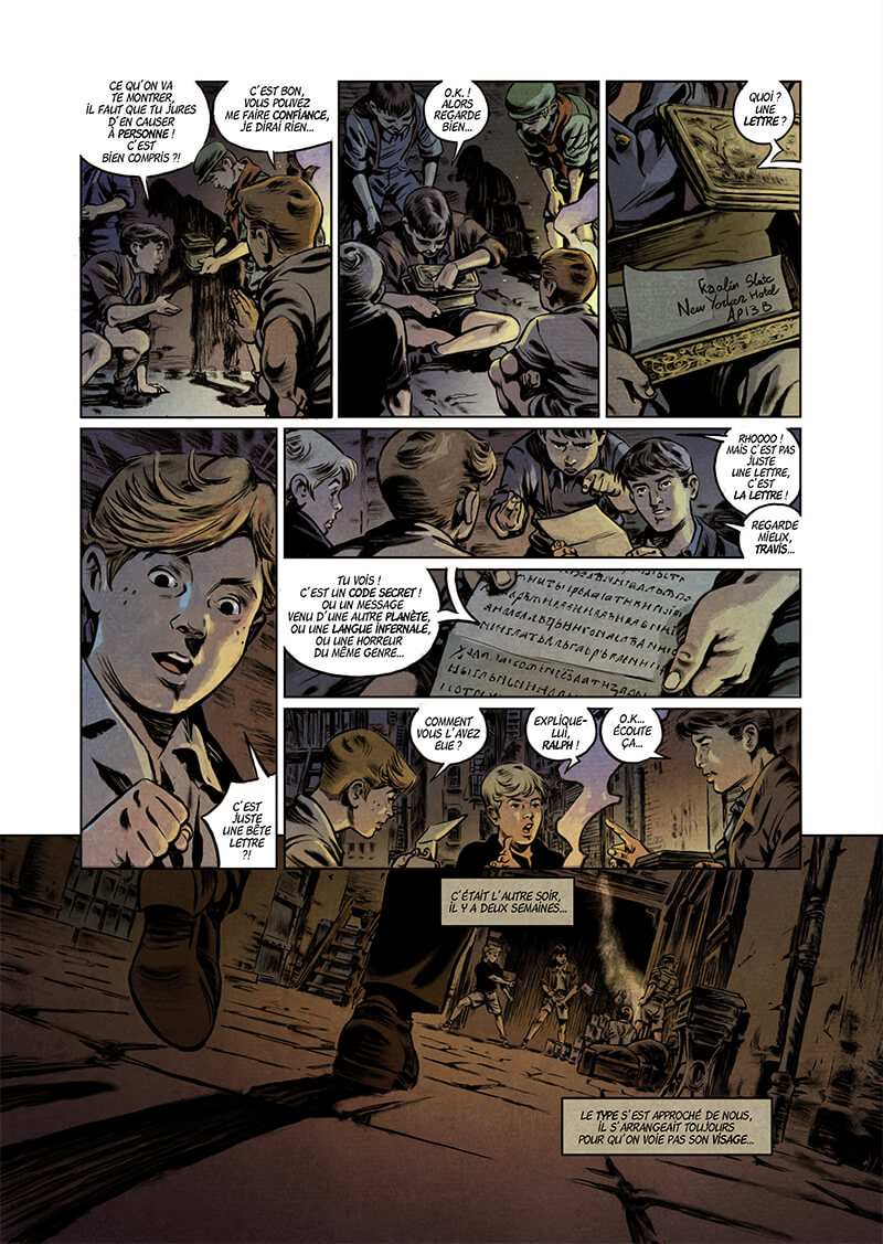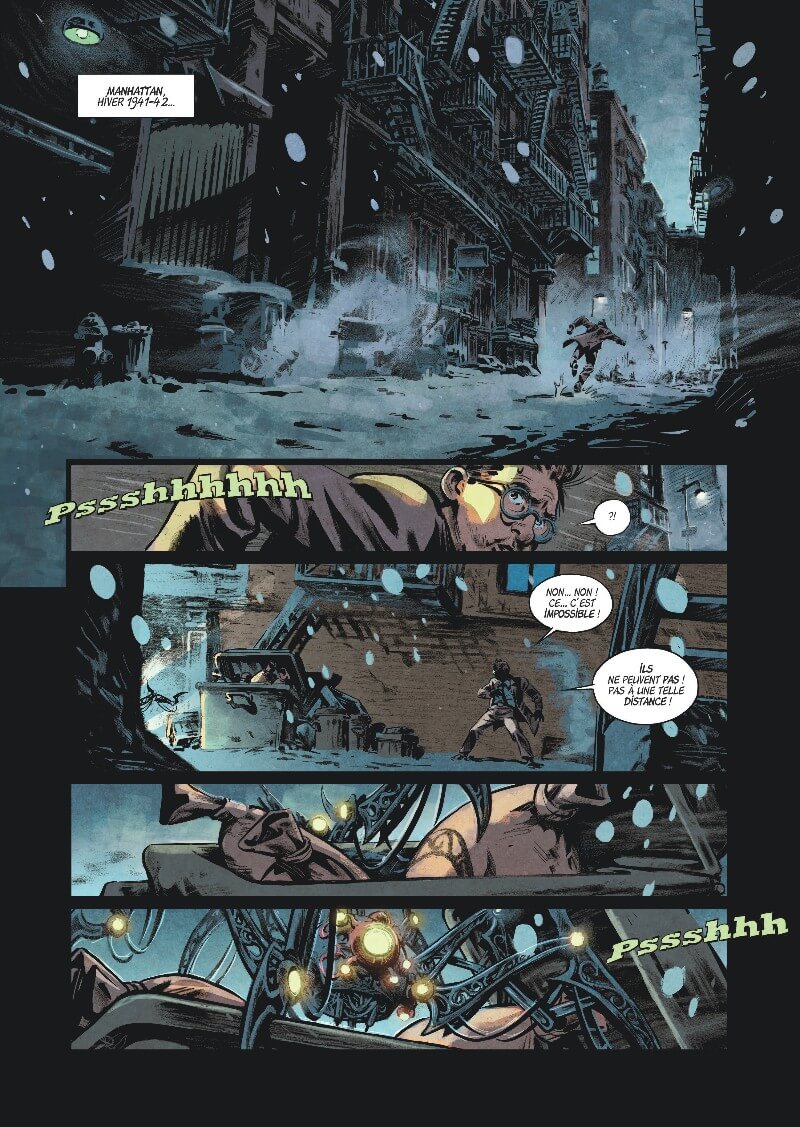 Résumé de l’éditeur : « Rumeurs de débarquement de sous-marins allemands sur la côte est… Mystérieuses apparitions, et disparitions, sur les bords de l’East River… Mise sous tutelle des laboratoires d’Edison par le FBI… Expérimentations de terribles armes secrètes par les forces japonaises dans le Pacifique… Pour celui qui sait voir au-delà des apparences de calme trompeur, tout démontre que New York sera bientôt plongée au coeur des événements qui ravagent aujourd’hui le reste du monde… Et nous sommes toujours sans nouvelles de Nikola Tesla, probablement le seul savant dont l’originalité et les inventions géniales sont susceptibles de nous fournir une aide décisive dans cette guerre destructrice ! New York, un été 1942… Une enquête de T.S. Billing, notre reporter du Daily Worker Au même moment, le jeune Travis emménage avec sa mère dans un hôtel meublé de Manhattan. Il ne sait pas encore que son énigmatique voisin de palier va l’entraîner dans une aventure aux ramifications scientifiques terribles et galvanisantes.