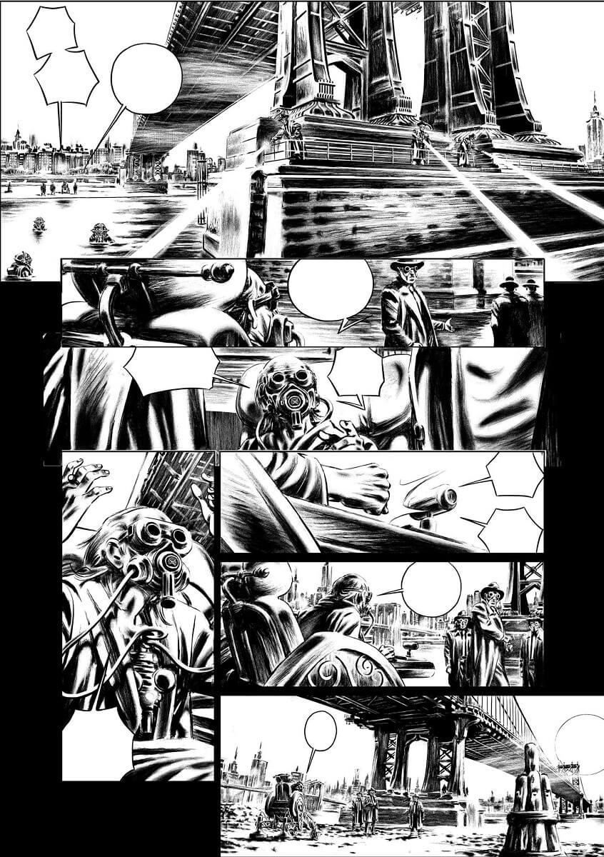 L’ambiance rétro-futuriste convient parfaitement à son dessin réaliste et classique. Les cadrages (plongées, contre-plongées) et son découpage sont d’une grande force. La couverture (les deux suivantes sont visibles au recto) possède un charme vintage, proche des comics américains des années 40/50. Une belle reconnaissance pour ce dessinateur de grand talent.