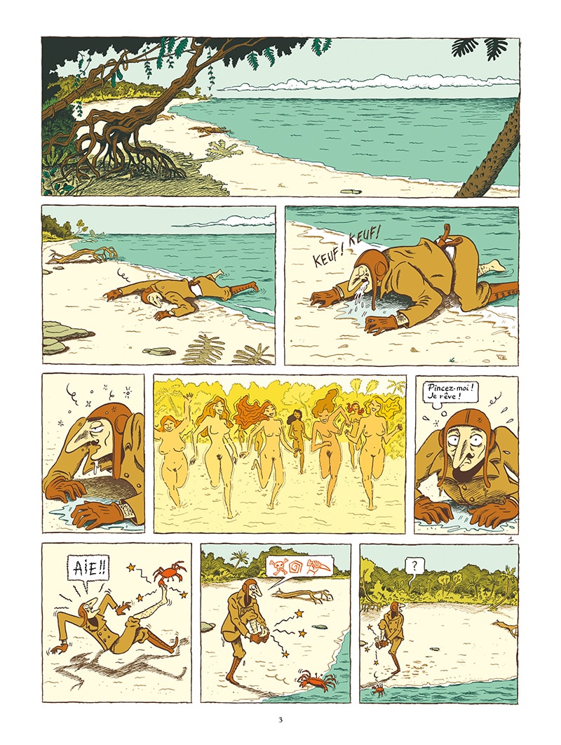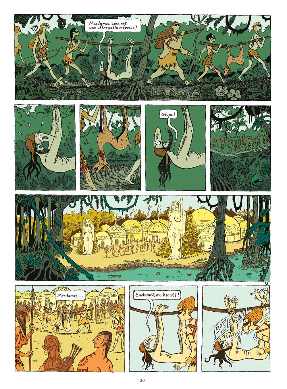 Le récit de Zanzim est une très belle fable fantaisiste et rafraîchissante. L’auteur de Ma vie posthume (avec Hubert, Glénat) met en scène Céleste, comme une sorte de Robinson Crusoë ou Tom Hanks dans Seul au monde. Mais le premier paradoxe de ce coureur de jupons est de se retrouver dans une société inversée. En effet, au début du 20e siècle (comme cela peut être encore le cas parfois actuellement), le pouvoir politique et professionnel est détenu exclusivement par les hommes. Mais pour son histoire, cette fois-ci, ce sont les femmes qui ont tous les pouvoirs sur ce coin de paradis. Comme chez les Amazones de la mythologie grecque, les hommes ne servent uniquement qu’à la reproduction. Une drôle de gageur pour Céleste et ses multiples conquêtes qui ne lui servent qu’à son plaisir. Dans cette société matriarcale, la misandrie est donc le moteur du village. Cet ouvrage est donc aussi un manifeste contre les préjugés sexistes qui perdurent encore de nos jours.