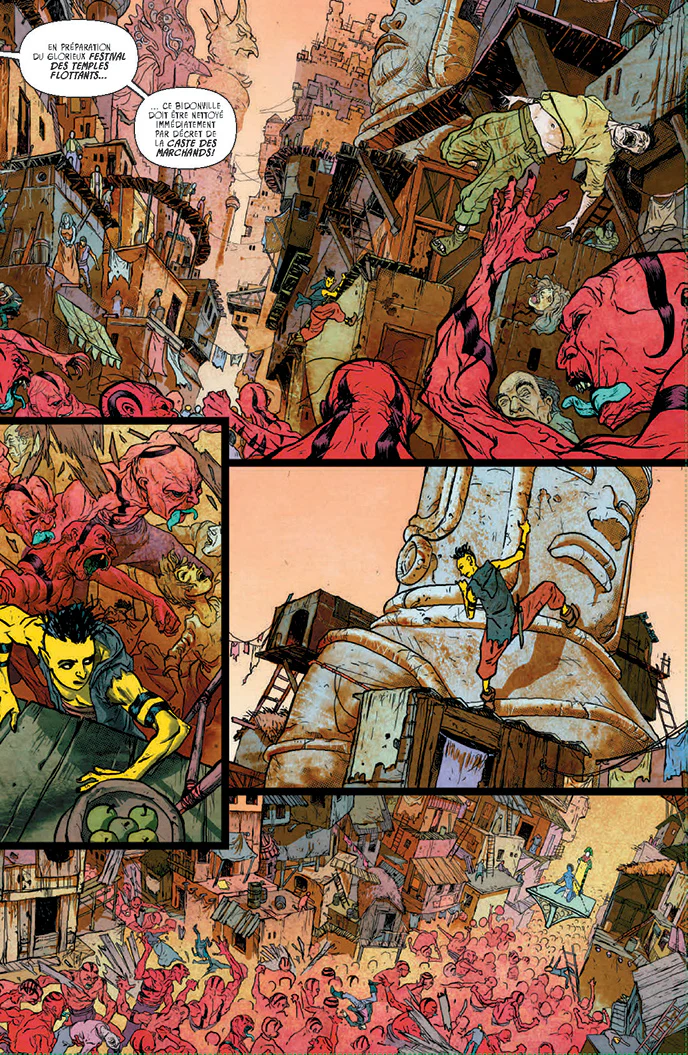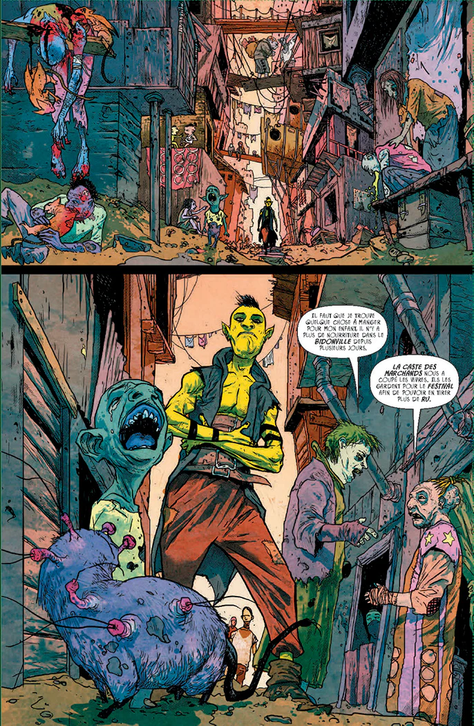Il est secondé avec talent par le coloriste Matt Hollingsworth, grosse référence actuelle, qui vient apporter des effets numériques qui sont pour beaucoup dans l’immersion dans ce monde. C’est une performance graphique très aboutie, très lisible, mais en même temps légèrement stressante. Pour illustrer le monde de l’île aux Orcs, il fallait tout cela. On sent que les deux artistes graphiques ont pris beaucoup de plaisir dans la création de ce monde et de sa charte graphique.