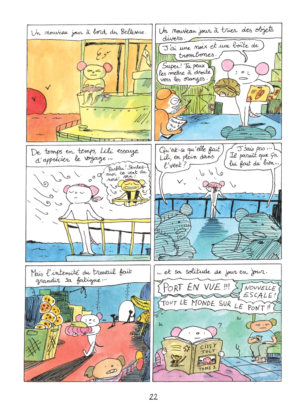 Lili met les voiles aborde, sans être frontal, les conditions de travail et la répétition des tâches. L’immensité de la mer n’estompe pas les difficultés des souris sur le paquebot.