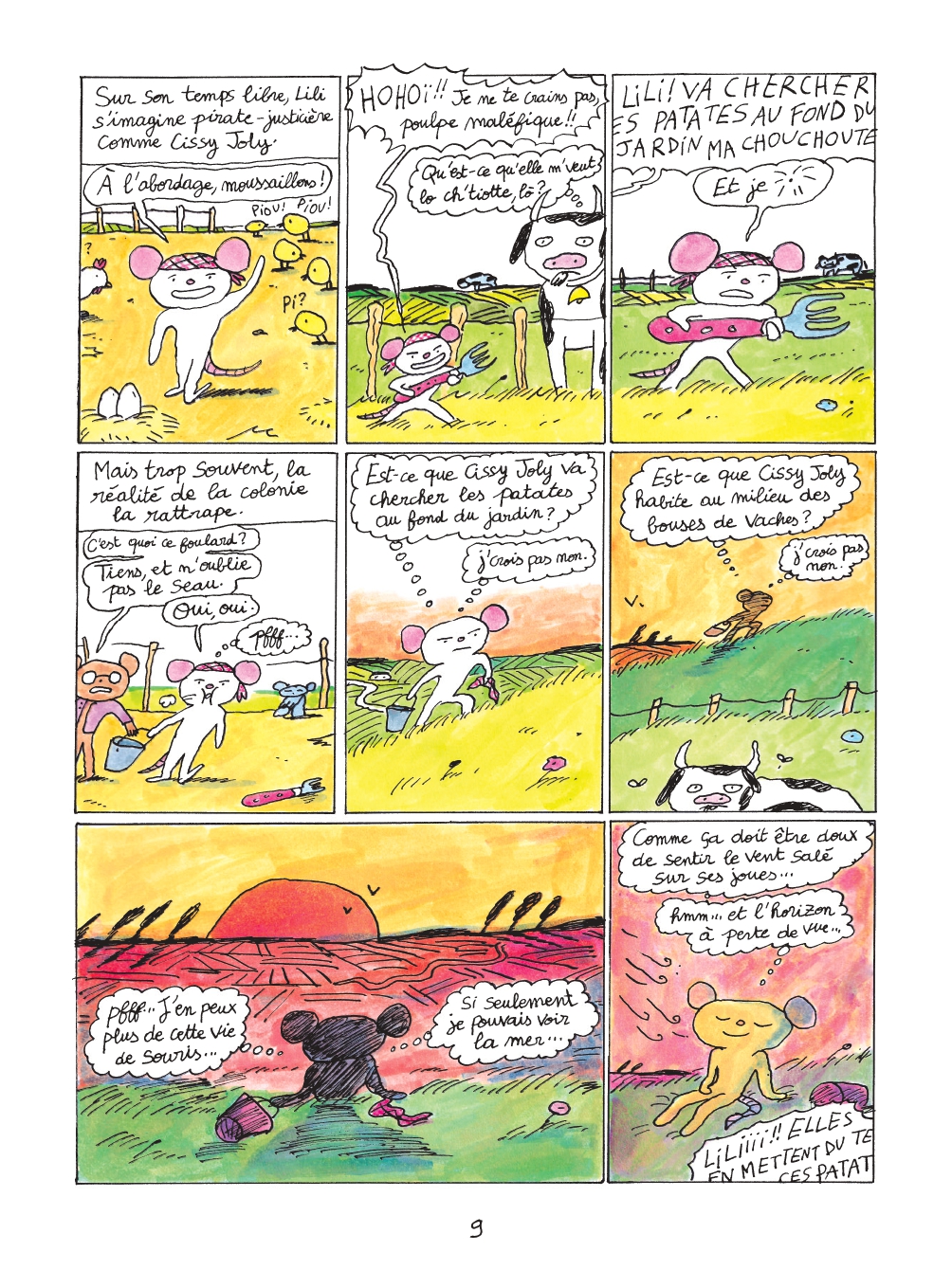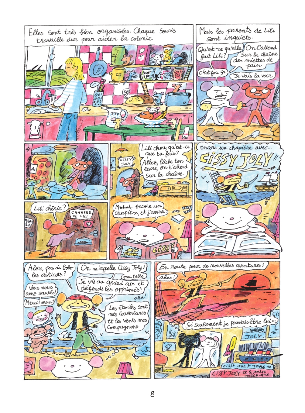 L’aventure coûte que coûte est un très bon sous-titre pour cette bande dessinée. Lili ne peut pas contenir son envie irrésistible de découvrir le monde. Cette soif d’aventures maritimes, elle la doit à sa frénésie pour la lecture des péripéties de Cissy Joly. Ce pirate-justicier enchante les nuits et les jours de la petite souris. Le quotidien de sa colonie ne la fait guère rêver.