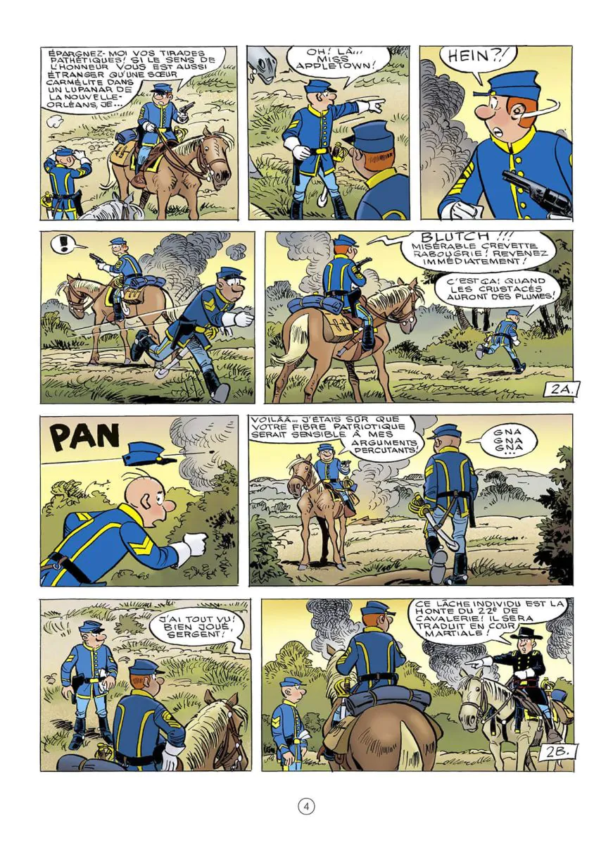 Résumé de l’éditeur : Condamné au peloton d’exécution pour une désertion de trop, Blutch se retrouve emprisonné, avec pour voisine la mystérieuse Isabella Boyd, elle-même frappée de peine capitale pour intelligence avec l’ennemi. Parvenant à s’évader avec cette dernière, l’ancien caporal intègre un groupe de conspirateurs sudistes, qui vont lui demander d’abattre le président Lincoln ! Blutch, pacifiste par nature, parviendra-t-il à résister à l’insistance de ses nouveaux « amis » ? Cela s’annonce compliqué, car les charmes de la belle Isabella semblent l’éloigner des bras de Chesterfield qui, se sentant coupable de l’arrestation de son ami, le recherche désespérément…