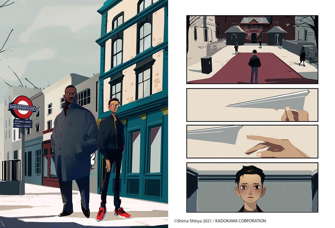 Elle porte son histoire avec une graphisme envoûtant, architectural. Des jeux d’ombre subtils donnent de la vivacité aux expressions des personnages aux traits bien marqués, presque félins, et aux textures duveteuses dans un Londres froid et rigide. Ce dessin est accompagné par une couverture moderne qui intrigue et par quelques pages couleurs. Une coloration très plane mais étonnamment chaude. Shima Shinya a un style hybride, à la fois glaçant dans son chara-design, mais pulpeux dans sa façon de dessiner la ville. L’hiver claque au mur, l’humidité suinte des pages tandis que nous sommes enveloppés dans une bonne écharpe. On ne doute pas une seule seconde être à Londres.