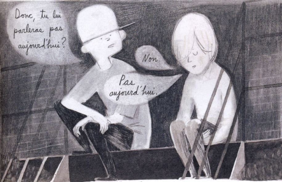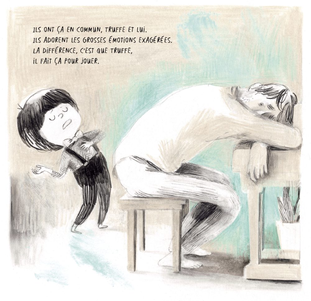 Comme Fanny Britt, Isabelle Arsenault fut récompensée par trois fois du prestigieux Prix du Gouverneur pour ses travaux d’illustratrice (la scénariste, pour sa pièce Bienveillance en 2013). Il faut souligner que son dessin se prête idéalement à Louis parmi les spectres, tant il est sensible et d’une belle poésie. Son trait hachuré en noir et blanc est agrémenté de sublimes touches de couleurs (jaune, bleu, rose). Faussement naïf, son dessin bénéficie de techniques différentes (feutres, aquarelles ou crayons de couleurs).