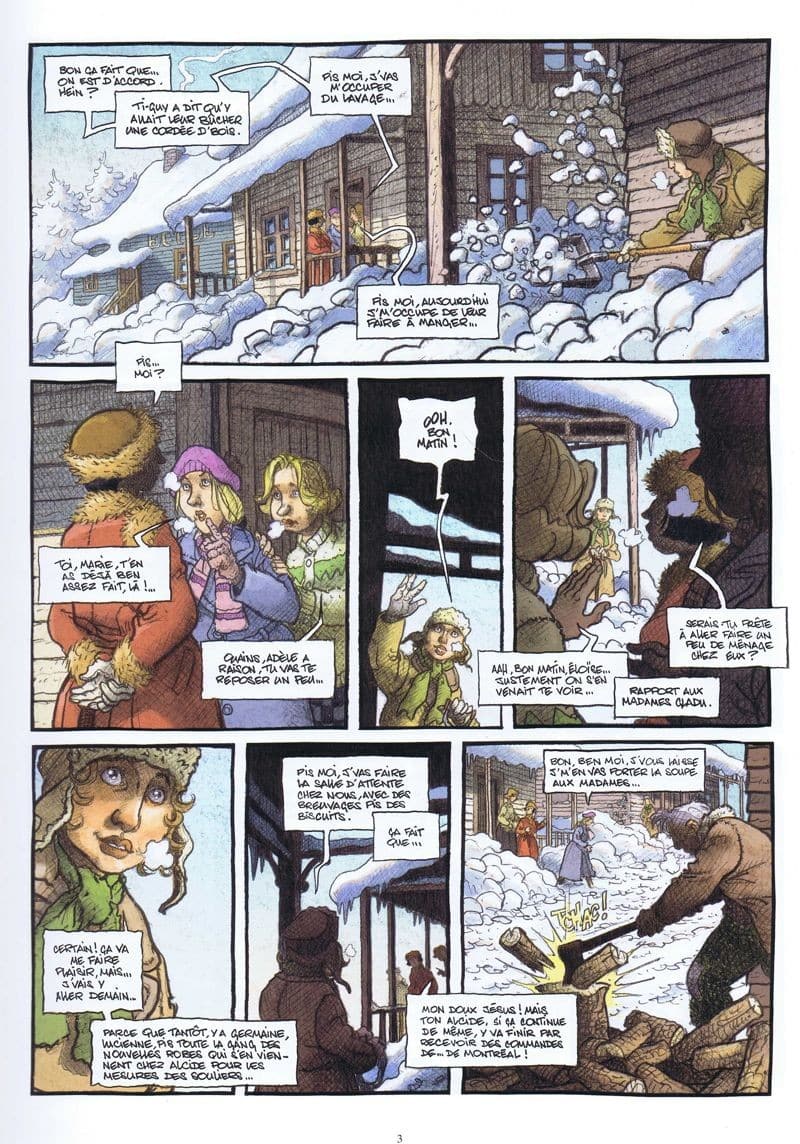 Notre-Dame-des-Lacs porte ses plus beaux habits d’hiver avec des dizaines de centimètres de neige qui lui confère encore plus d’isolement. Les hommes sont partis travailler dans les forêts d’Abitibi, loin de leurs femmes et enfants, restés au village. Comme par habitude, tout le monde vaque à ses occupations et l’attente du printemps n’est pas si lourde pour les habitants : les plus anciens coupent le bois, Marie continue tranquillement d’attendre l’arrivée de son futur bébé, toujours aussi belle et radieuse, Serge et Gaëtan préparent de bons petits plats pour les Madames Gladu, Réjan continue de se poser des questions sur sa vocation de prêtre et Noël, vieil anarchiste, peaufine les derniers réglages de son futur bateau.