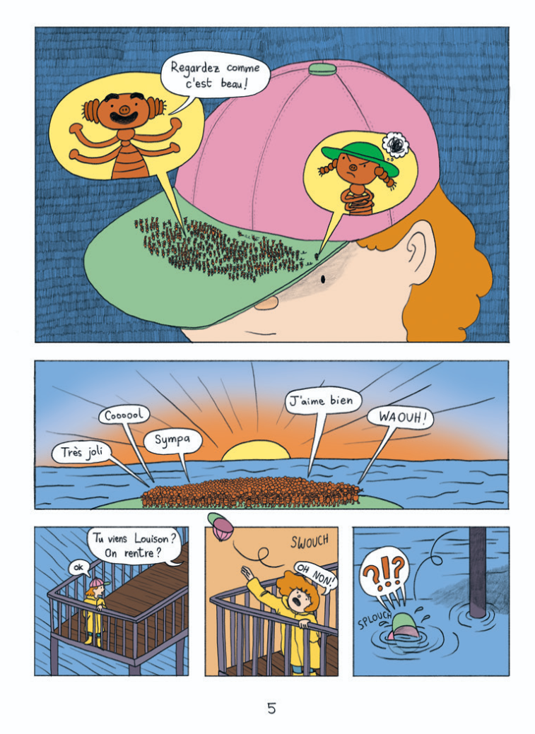 Louison et ses parents se promènent le long de la jetée. C’est à cet endroit qu’un coup de vent décoiffe la jeune fille. Sa casquette s’envole avec la famille de poux, venue admirer le coucher de soleil sur la visière.