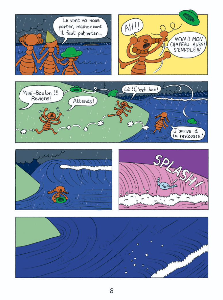 La casquette tombe à l’eau et dérive. Pire, le chapeau de Mini-Boulon s’envole lui aussi. Il se précipite dans l’eau pour le récupérer. Mais, une vague le submerge. Le petit pou se retrouve alors sur une plage.
