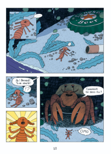 Ce challenge n’est pas de son fait. C’est cette emprise par Omar sur Mini-Boulon que Henriette Soleil et Youri Roseau mettent en lumière pour mieux la dénoncer. Le petit pou ne le fait pas pour lui mais pour faire plaisir. Et en plus, le quotidien avec le bernard-l’ermite ne sera pas tout rose.