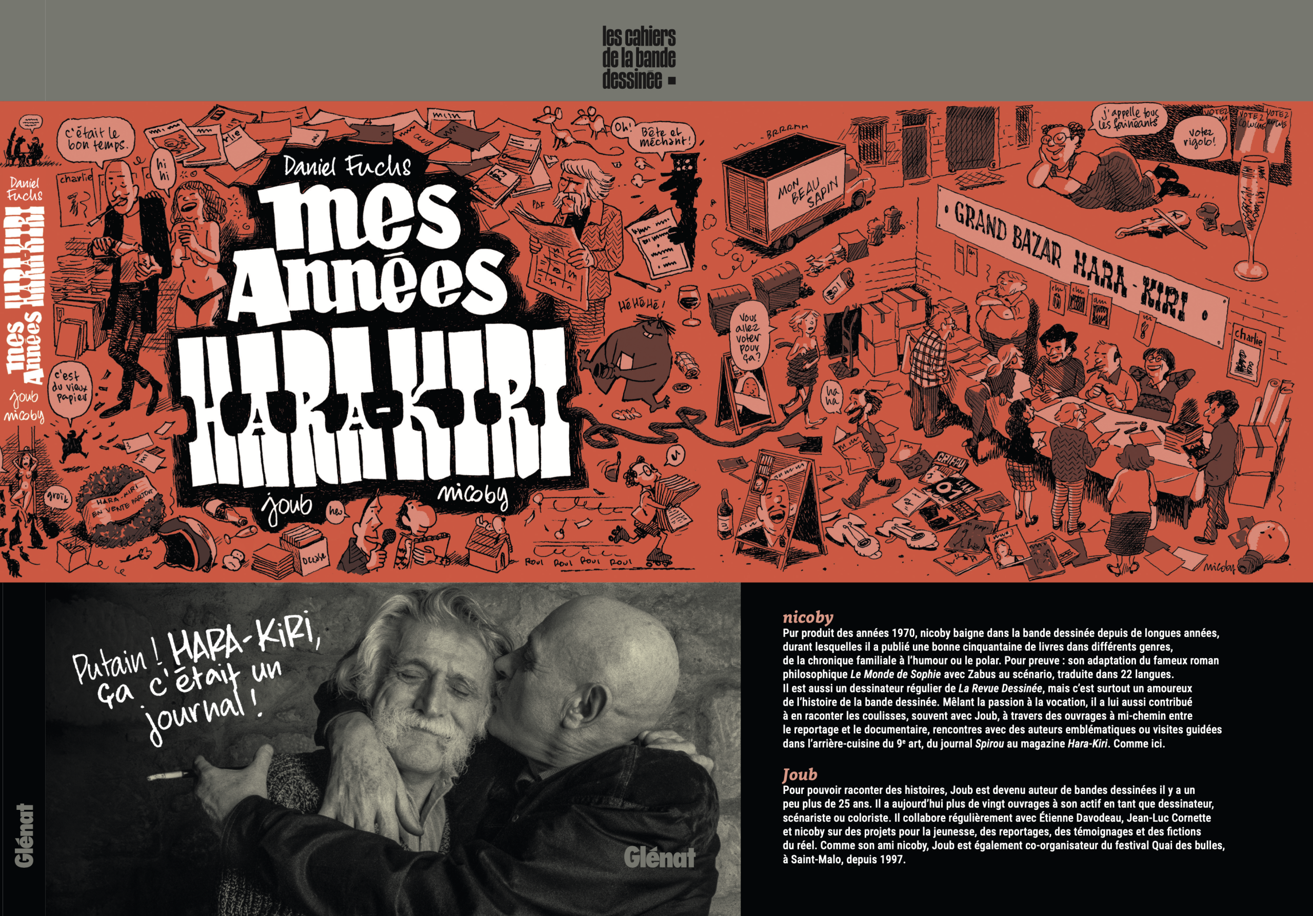 L’histoire de Hara-Kiri est fascinante tant le journal a fait exploser les barrières de l’humour et révélé des talents. La rédaction de Hara-Kiri, de Charlie Hebdo, de La Gueule ouverte et d’autres encore, était un repaire d’anars, de révoltés visionnaires, de marginaux, qui ont contribué à faire de ce journal un symbole de la liberté d’expression. Il y avait de la provocation, de la bêtise et sûrement de la vulgarité… Aujourd’hui, Hara-Kiri appartient à notre mémoire collective et son histoire a maintes fois été racontée par ceux qui l’ont faite. Daniel Fuchs était l’un d’entre eux. Quarante ans après, il continue de dire : « Putain ! Hara-Kiri, ça, c’était un journal ! » et de raconter mille souvenirs qui rappellent ce que c’était que d’œuvrer dans les coulisses. C’est cette parole que Joub et Nicoby ont décidé de recueillir et de transposer dans une bande dessinée à mi-chemin entre le documentaire et le témoignage, accompagnée d’une préface de Stéphane Mazurier, historien qui a soutenu une thèse intitulée… L’Hebdo Hara-Kiri/Charlie Hebdo, un journal des années 1970 (1969-1982). Mes années Hara-Kiri nous permet de redécouvrir l’espace d’un instant le récit d’une époque à travers l’une des plus belles aventures de la presse. Zoom sur une époque de liberté et d’audace où l’on a cru pouvoir rire éternellement, se moquer des riches et des puissants et changer le monde…