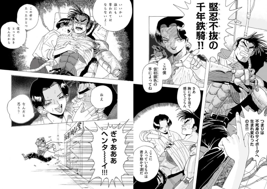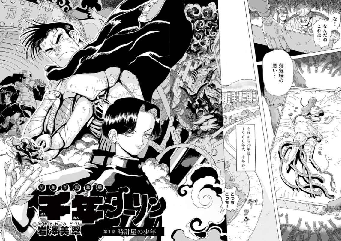 Résumé de l’éditeur : En cette année 1980, la paisible ville de Sen-nen Dani est le théâtre d’enlèvements de sans-abris. Recherchant désespérément son ami et père de substitution, Ippei Tsukanoma, une montagne de muscle au grand cœur, est attaqué par une mystérieuse créature. Sauvé in-extremis par Gin-iro Karisome, jeune horloger dont le raffinement n’a d’égale que la beauté, il devient Sen-nen Darling, un cyborg à la puissance démesurée. Grâce à ses nouvelles capacités, Ippei parvient à à détruire la créature responsable de l’enlèvement et du meurtre des sans-abris. Cependant, Ippei ne le sait pas encore mais il vient d’attirer sur lui l’attention des Mécananthropes, d’étranges êtres millénaires issus de l’union de la machine et de l’humain, ainsi que de leur chef, le terrible Neiron. À l’instar de Sen-nen Darling, ces créatures semblent tirer leur puissance des Magatamas, des pierres caractéristiques de la protohistoire du Japon. Les habitants de la ville sont menacés par Neiron. Sen-nen Darling se dresse en protecteur. Un affrontement sans précédent est sur le point de commencer.