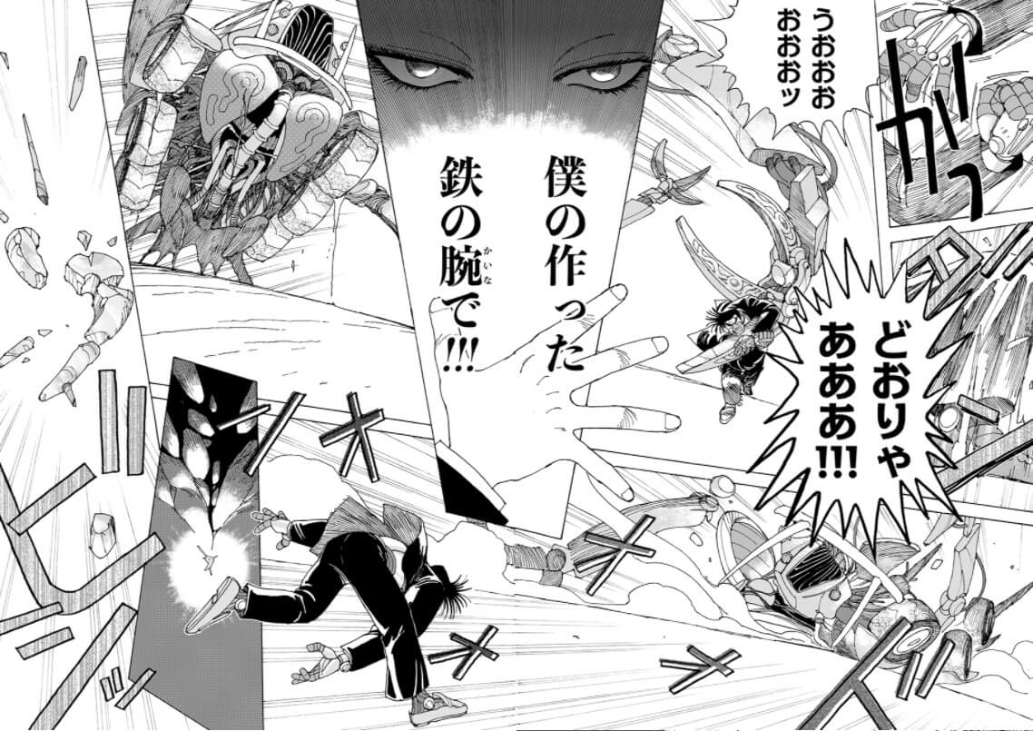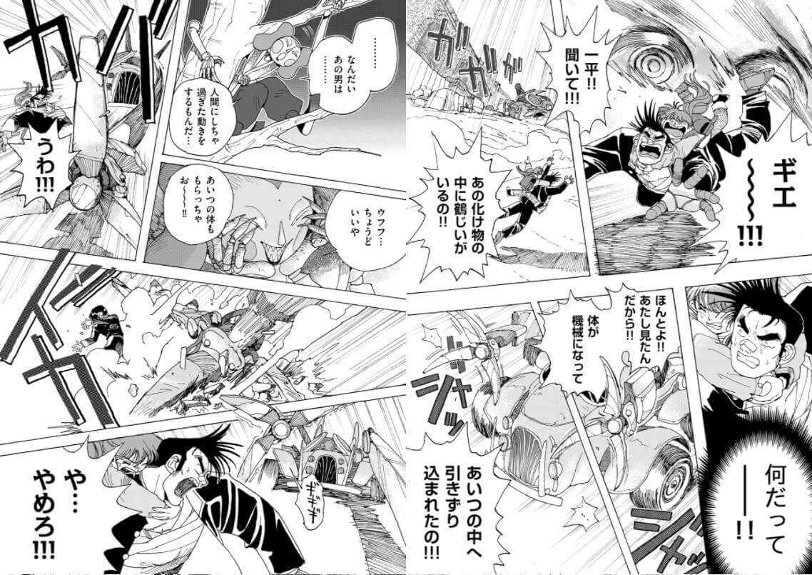 Mais de son corps d’origine, il ne reste que sa tête. Le reste, Gin-iro l’a remplacé par un corps d’acier. Et si cela est possible, c’est grâce à une technologie découverte en 1980. Elle permet de transformer de la chair en acier. Mais cette technologie, personne ne la possède, excepté les antagonistes et Gin-iro. A peine revenu à la vie, Ippei est confronté à un nouveau monde. Un monde où des êtres plus tout à fait humain essaient de récupérer ce qui le maintien en vie.