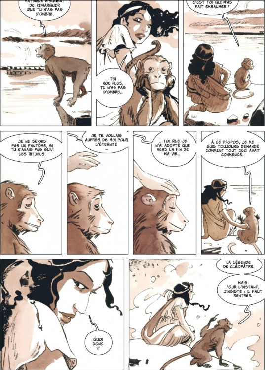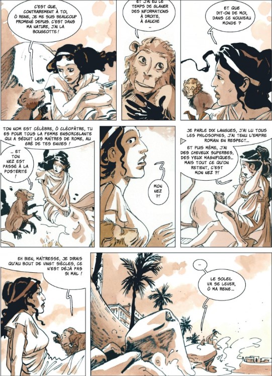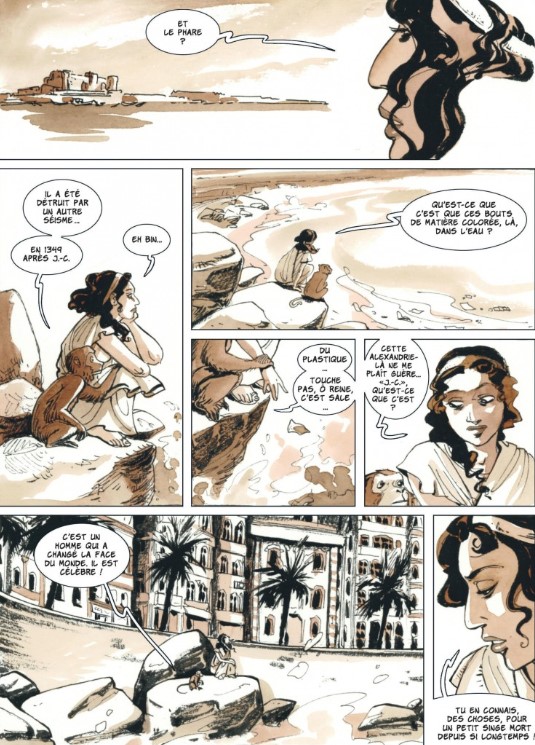 C’est donc à notre époque que débute cet album. Kleopâtra VII Philopator (fille aimant son père), assise en bord de mer, ne reconnaît plus son environnement. Ses palais ont disparu à cause d’un tremblement de terre. Le phare a été détruit par un séisme. La mer est jonchée de détritus qui altèrent la beauté de ce site. Elle décide donc de raconter sa vie à son petit singe, qui fut l’un de ses plus fidèles compagnons. Au point de l’avoir fait embaumer pour le garder auprès d’elle pour l’éternité.