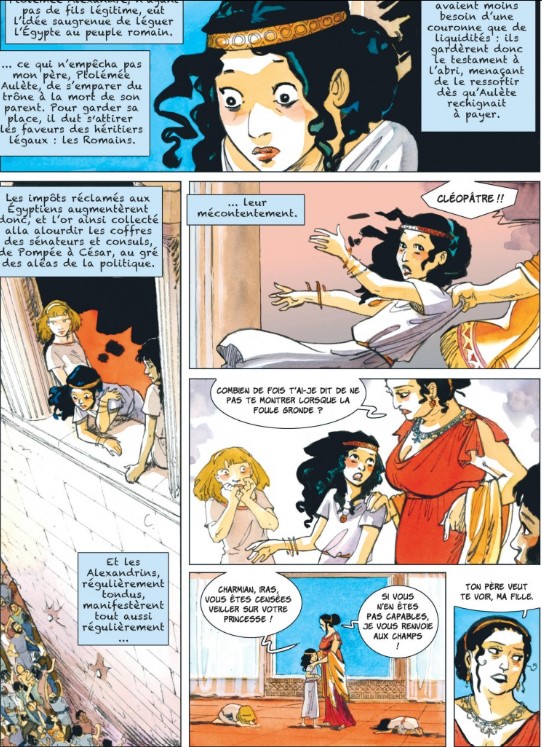 Cléopâtre s’y livre ainsi en toute confiance et y révèle sa véritable face. Celle d’une reine, mais aussi celle d’une femme, d’une amoureuse et d’une mère. Une vision de Cléopâtre inconnue, bien différente de celle à laquelle Elizabeth Taylor avait prêté ses traits. Ou de celle que nous avons tous rencontrée en compagnie d’Astérix et Obélix.