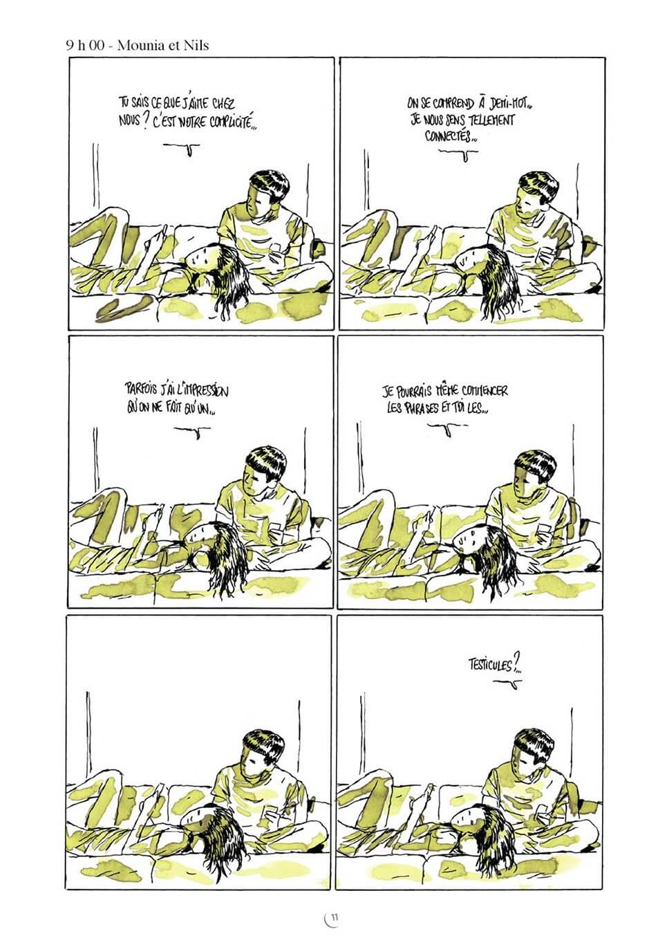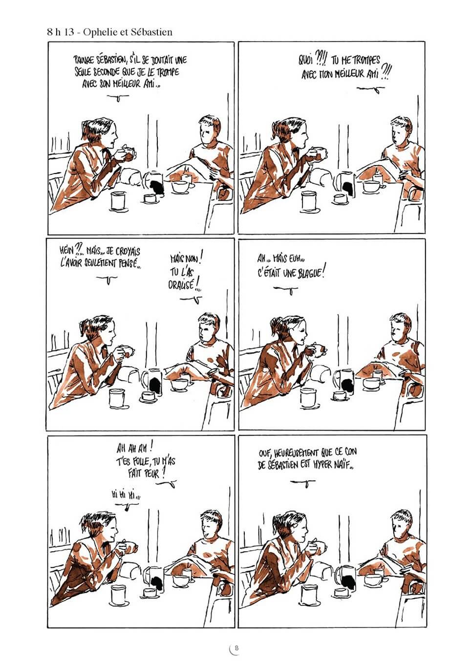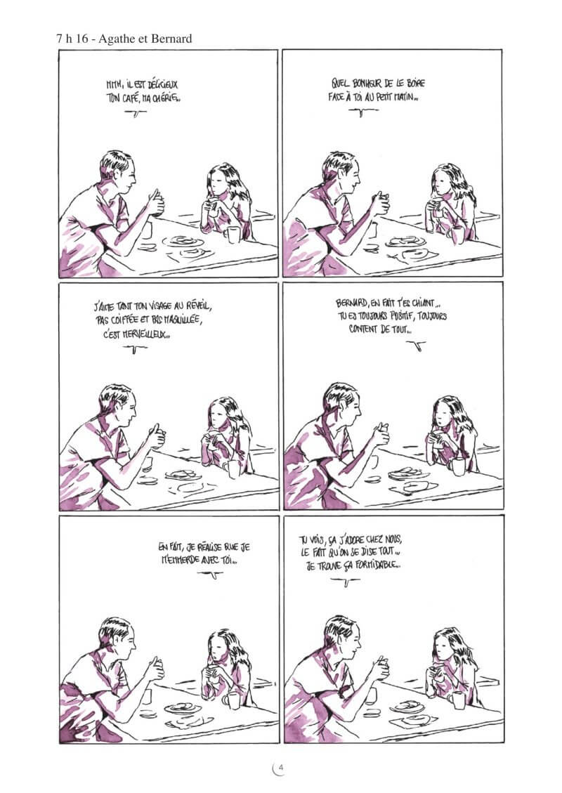 Dans un format ultracourt et utilisant une teinte différente pour chaque histoire, l’auteur de Zaï, zaï, zaï zaï et de Et si l’amour c’était aimer ? réussit souvent à faire mouche : dans la cuisine, sur l’oreiller, à la plage, au salon, il multiplie les scènes humoristiques.