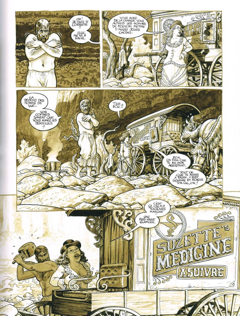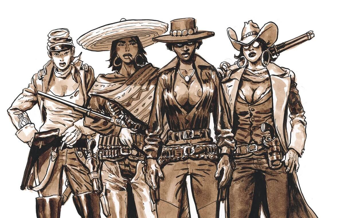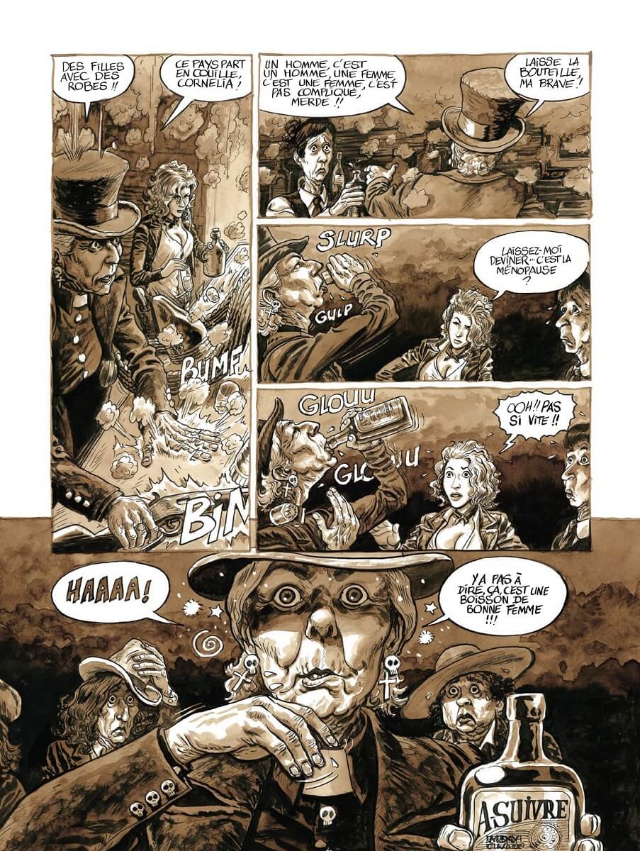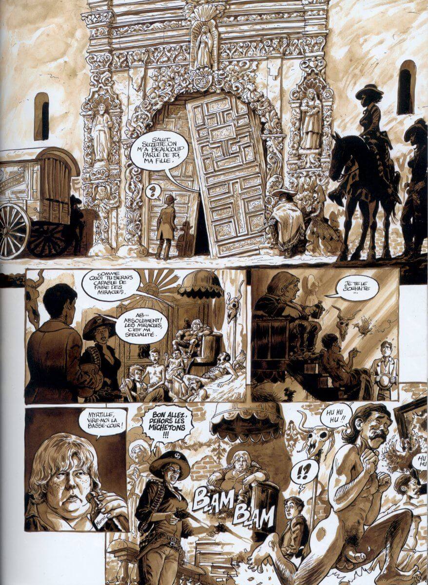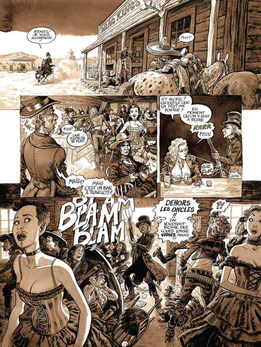 « Quand Yan Lindingre, le rédacteur en chef de Fluide Glacial, m’a proposé de travailler sur un western avec Dominique Bertail, j’étais très emballé parce que c’est un genre très codé, et qu’on peut vite s’amuser en jouant à modifier les codes. Et en l’occurrence, c’est un genre hyper sexué, donc j’étais assez curieux de voir ce qui pourrait se passer si on inversait les rôles », confie le l’auteur de J’aurai ta peau Dominque A (avec Olivier Balez).
