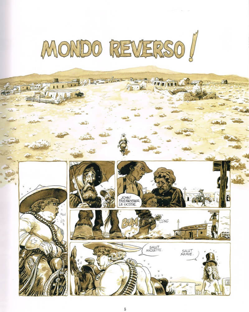 Grâce à l’imagination du scénariste de Soucoupes (avec Obion), le lecteur tient entre ses mains une histoire moderne, transgenre et féministe. Si dans les westerns classiques certains hommes se comportent mal, dans Mondo Reverso c’est à certaines femmes d’en faire autant !