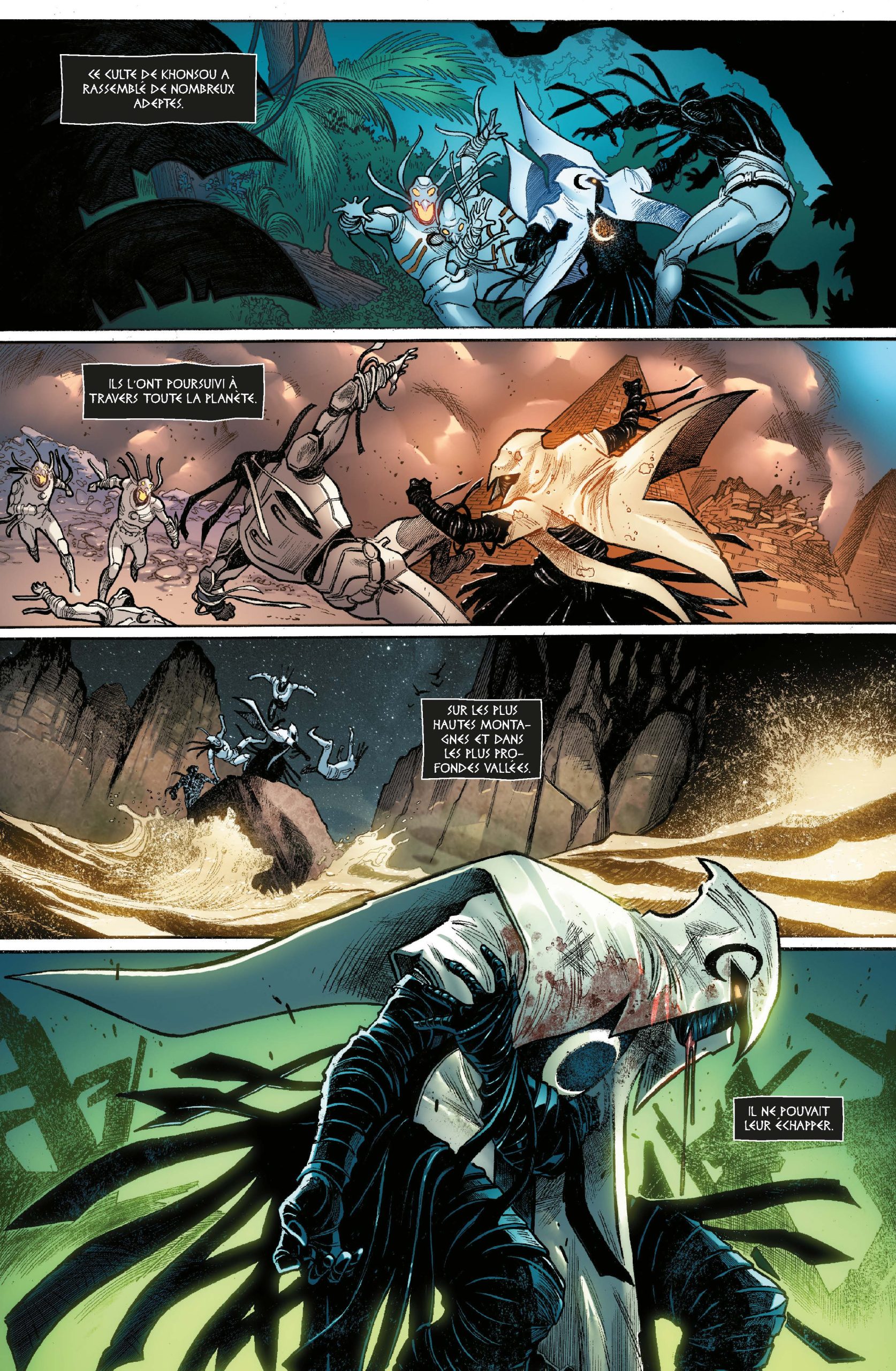 Khonsou est le dieu égyptien de la Lune, de la nuit et des voyageurs. Désireux d’agir sur le monde des mortels, il a fait de Marc Spector Moon Knight, le poing de Khonsou. Son agent et son meilleur combattant. Mais il n’a pas attendu le XXe siècle pour cela. Et à travers le temps, à travers le monde, d’autres hommes et d’autres femmes ont tenu ce rôle. Ou le tiendront à l’avenir.