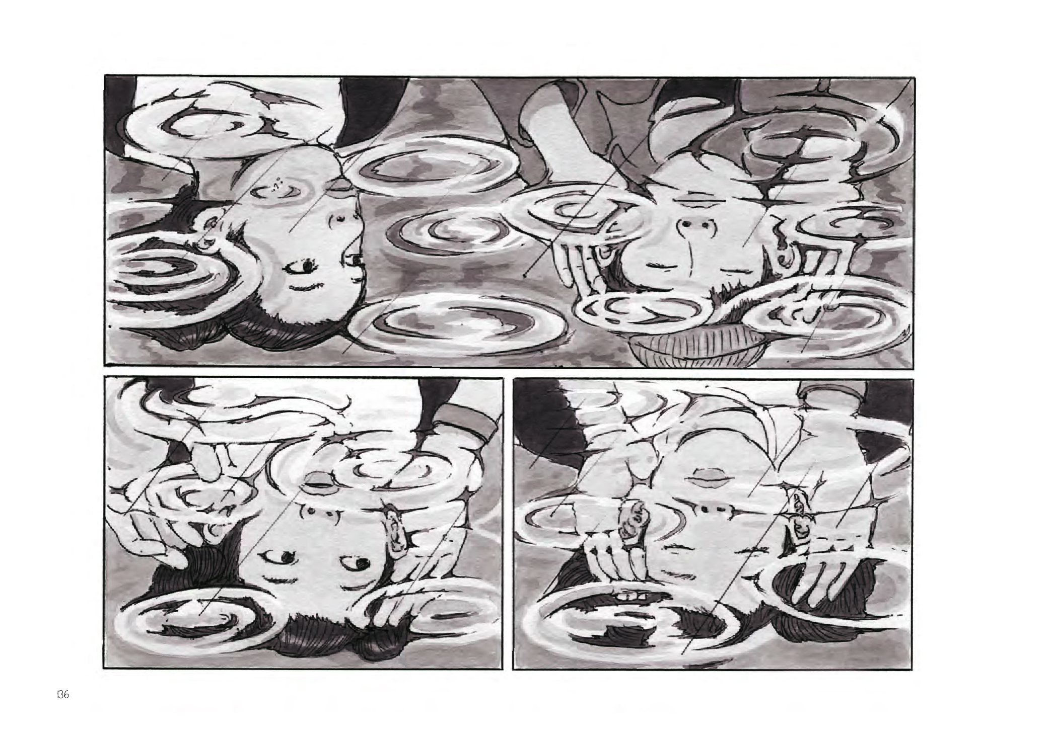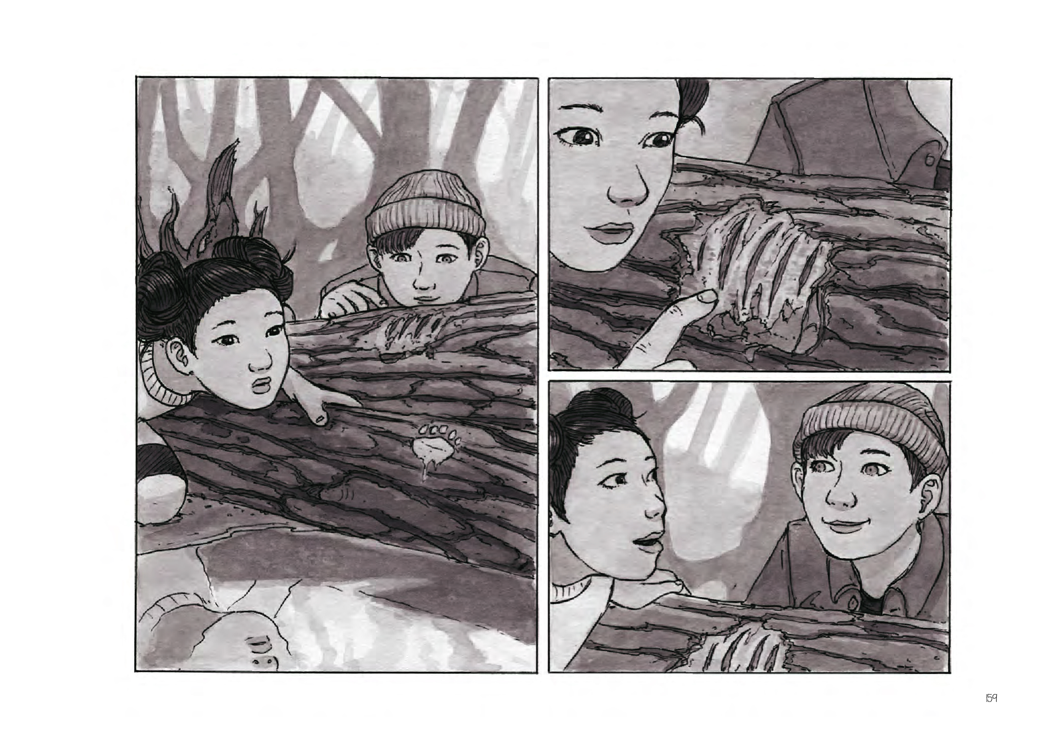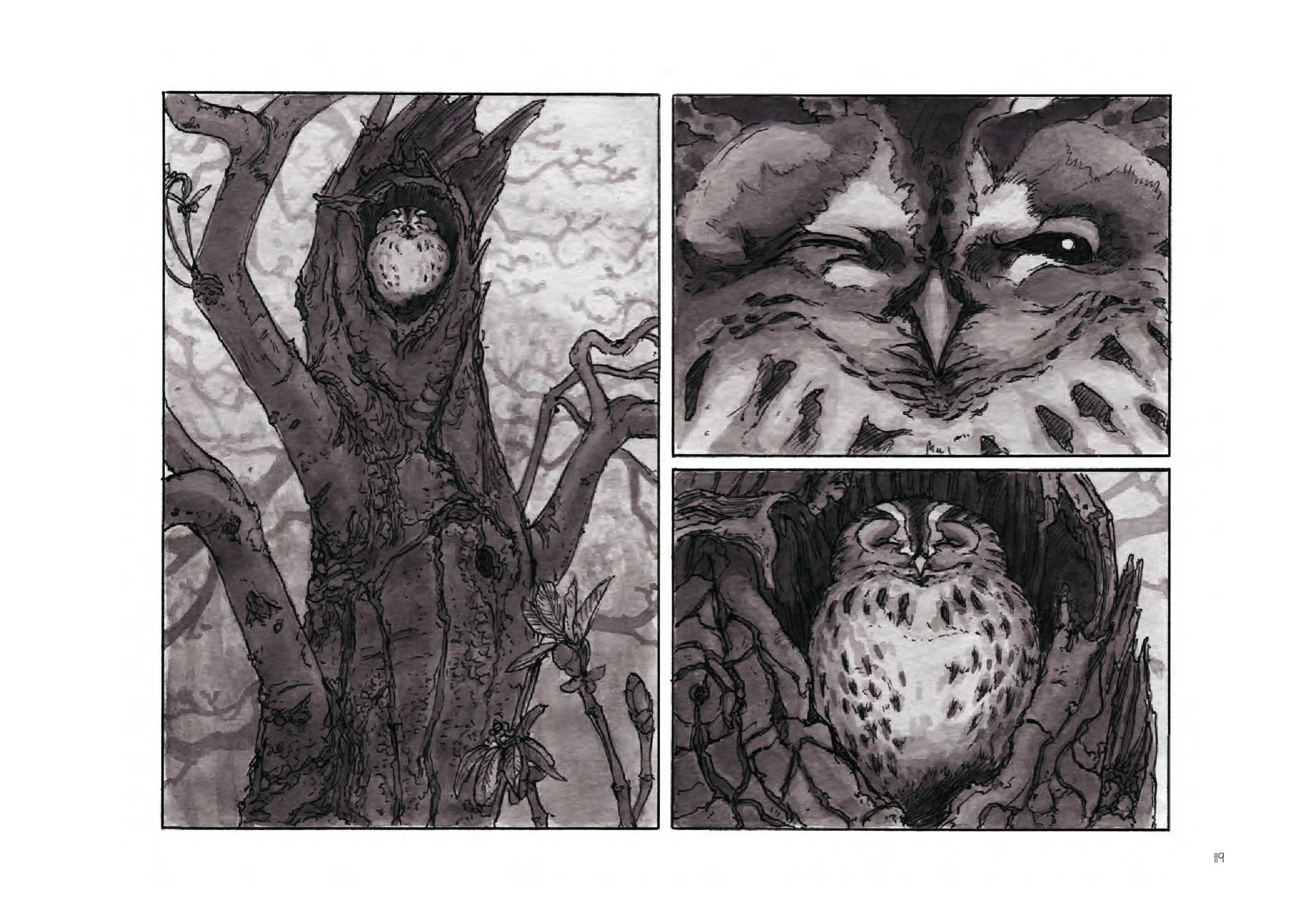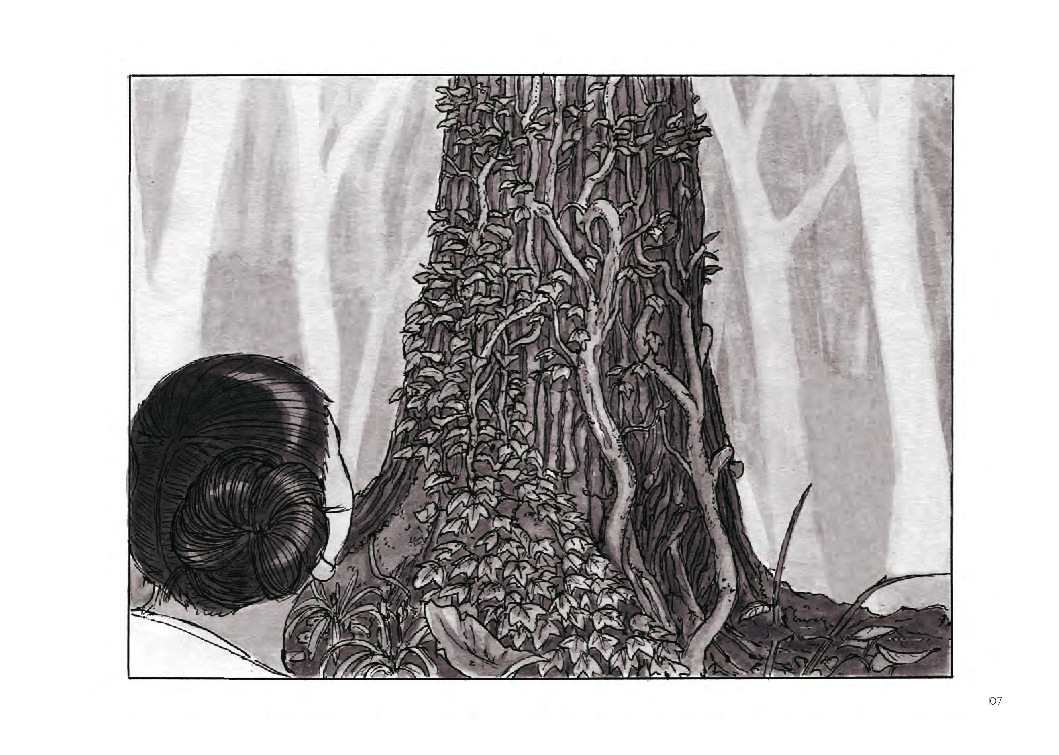Kengo Kurimoto propose une véritable promenade en nature à travers Murmures des sous-bois. La bande-dessinée est à l’encre et à la peinture. Dans un dégradé de brun qui nous donne à entendre la pluie sur les troncs, les flaques d’eau et le plumage des corbeaux.