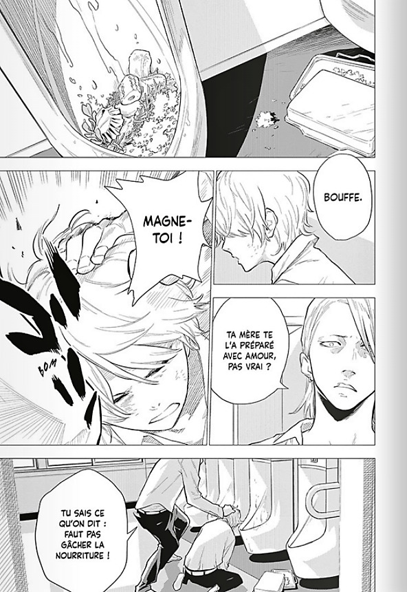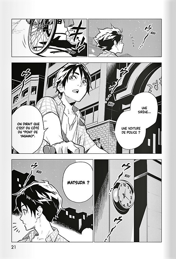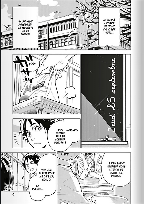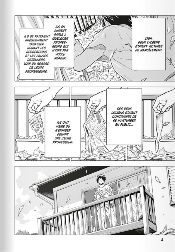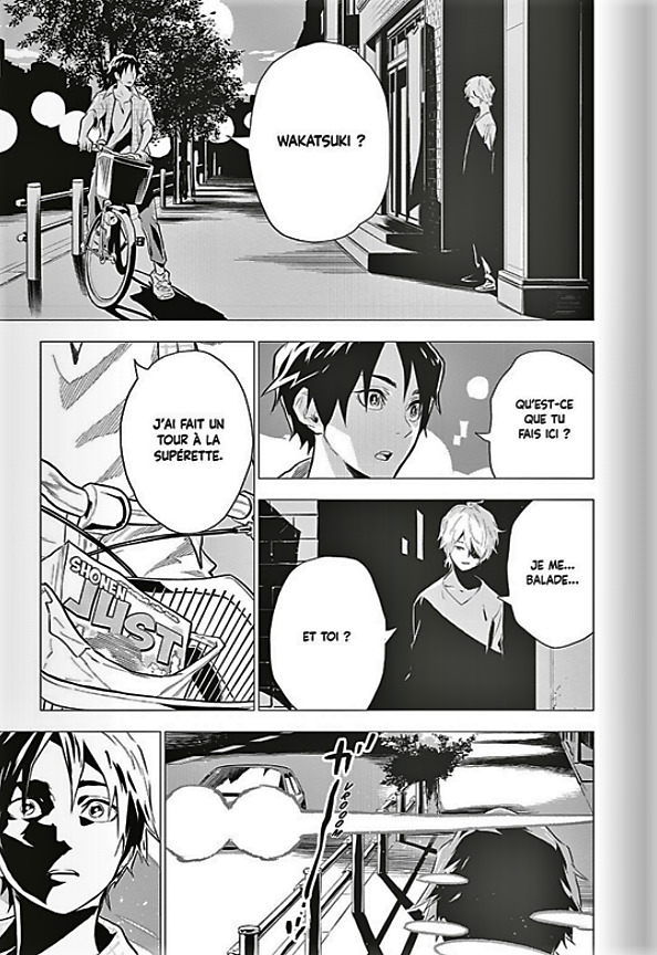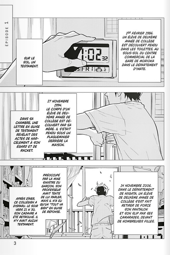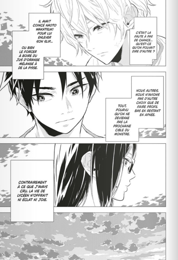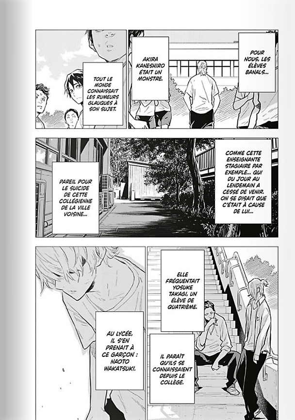 Résumé de l’éditeur : Tout commence par la découverte du cadavre de Kaneshiro, un odieux lycéen qui harcèle perpétuellement ses camarades. Les soupçons se tournent rapidement vers Wakatsuki, un étudiant qui est introuvable depuis ce meurtre. Matsuda, un camarade de Wakatsuki, va alors le prendre sous son aile pour le cacher, d’autant plus qu’il est persuadé que Wakatsuki n’est pas réellement coupable du meurtre…