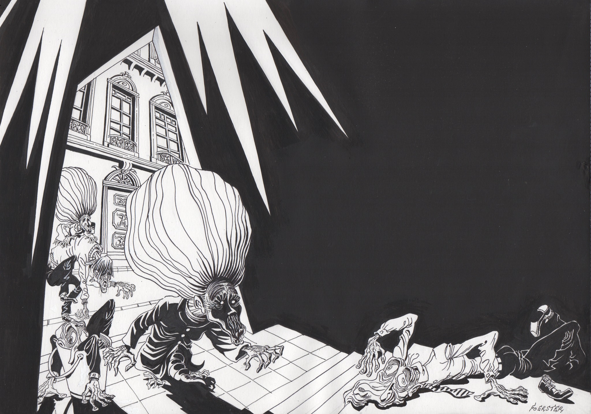 Depuis ses premiers albums, Certains l’aiment noir ou encore L’appel du fossoyeur , Philippe Foerster n’a eu de cesse d’imprimer sa marque sur la bande dessinée fantastique. Des noirs profonds, un trait déstructuré, comme si la main de son auteur tremblait, des visages tordus par l’effroi, sont autant de jalons dans une oeuvre au noir qui fait appel aussi bien aux grands films expressionnistes que plus récemment aux films de Tim Burton…