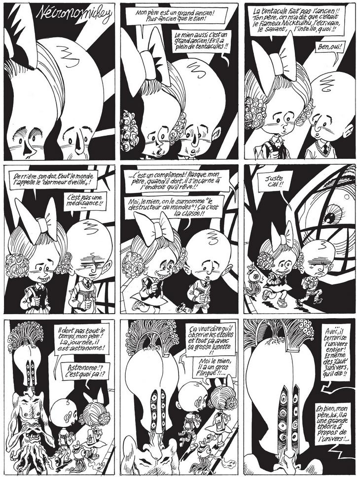 Une explication tout d’abord. Pourquoi ce titre ? Le Nécronomickey est un premier hommage à l’auteur du Nécronomicon, un ouvrage fictif évoqué pour la première fois dans la nouvelle La Cité sans nom. Le Nécronomicon, livre maléfique entre tous, aurait été écrit par un certain Abdul al-Hazred, poète arabe fou. Quiconque ouvrirait ce livre pourrait sombrer dans la folie, serait témoin d’apparitions surnaturelles et s’exposerait à la mort…