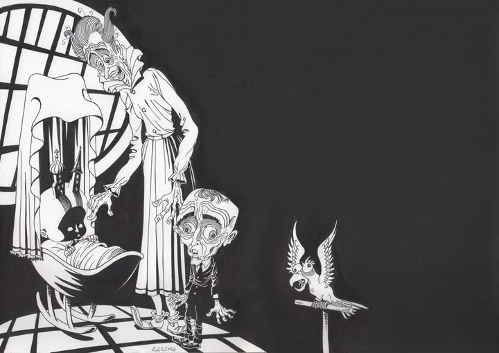 Tu l’auras compris, lecteur, nous voici conviés à entrer dans un monde parallèle où se côtoient de drôles de créatures, asticots géants, poulpes hideux et oiseaux de malheur. C’est là qu’évolue la famille Faramine, dans un décor inquiétant, maisons sinistres et « manoirs perchés ».