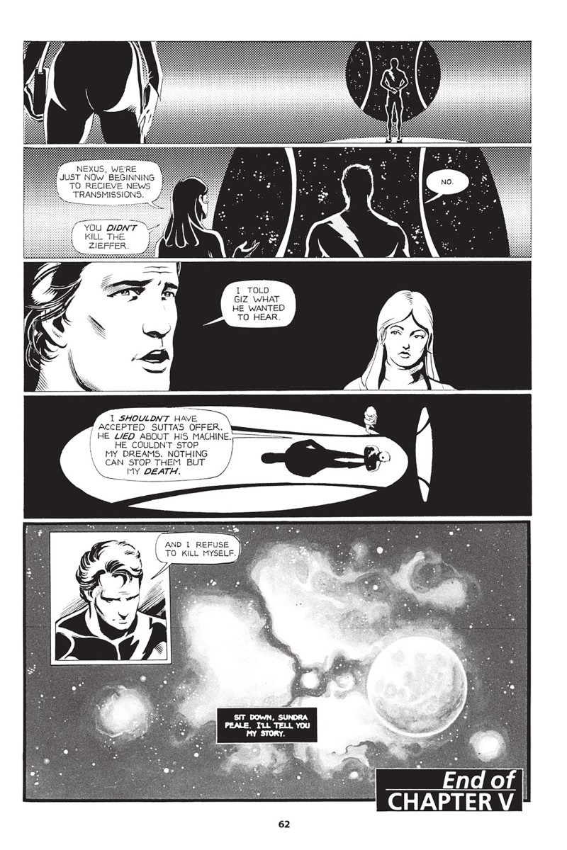 Résumé de l’éditeur : Bienvenue au Vingt-Cinquième siècle, aux confins de la galaxie, sur la Lune d’YLUM, siège d’une base-cité souterraine extraterrestre antique devenue le repaire du tout-puissant NEXUS. Celui-ci est investi de pouvoirs extraordinaires par le dernier représentant alien de cette cité dans un but précis : traquer les criminels de guerre et assassins de masse, et les éliminer. A commencer par son propre père. Les « cibles » lui sont envoyées peupler ses rêves dans lesquels il va revivre leurs crimes, jusqu’à ce que, pour échapper à la folie, il doive accomplir ses missions sans autre forme de procès. En parallèle de ces missions qui le coupent progressivement de toute humanité, NEXUS décide d’ouvrir les portes de sa cité d’accueil à tous les réfugiés de conflits planétaires que personne ne veut accueillir et dont il décide de devenir le protecteur. Il espère ainsi pouvoir se servir de ses pouvoirs pour combattre certains injustices et fonder un havre de paix dans lequel il tiendra à distance à la fois la solitude et l’univers mortifère dans lequel l’enferment ses missions. Mais ces nouveaux compatriotes rêvent d’indépendance et peu à peu décident de prendre leur destin entre leurs mains et fonder leur propre état, ouvrant ainsi la porte à de nouvelles tensions sociales et politiques…
