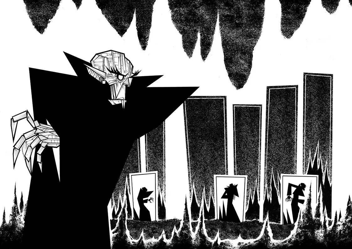 Alors arrive la seconde partie. Celle-ci fait écho aux panneaux intertitres du cinéma muet, puisqu’elle se compose d’un récitatif sur la page de gauche et d’une séquence de BD muette en une bande, sur la page de droite. Ce récit semble offrir une conclusion définitive à l’histoire du vampire.