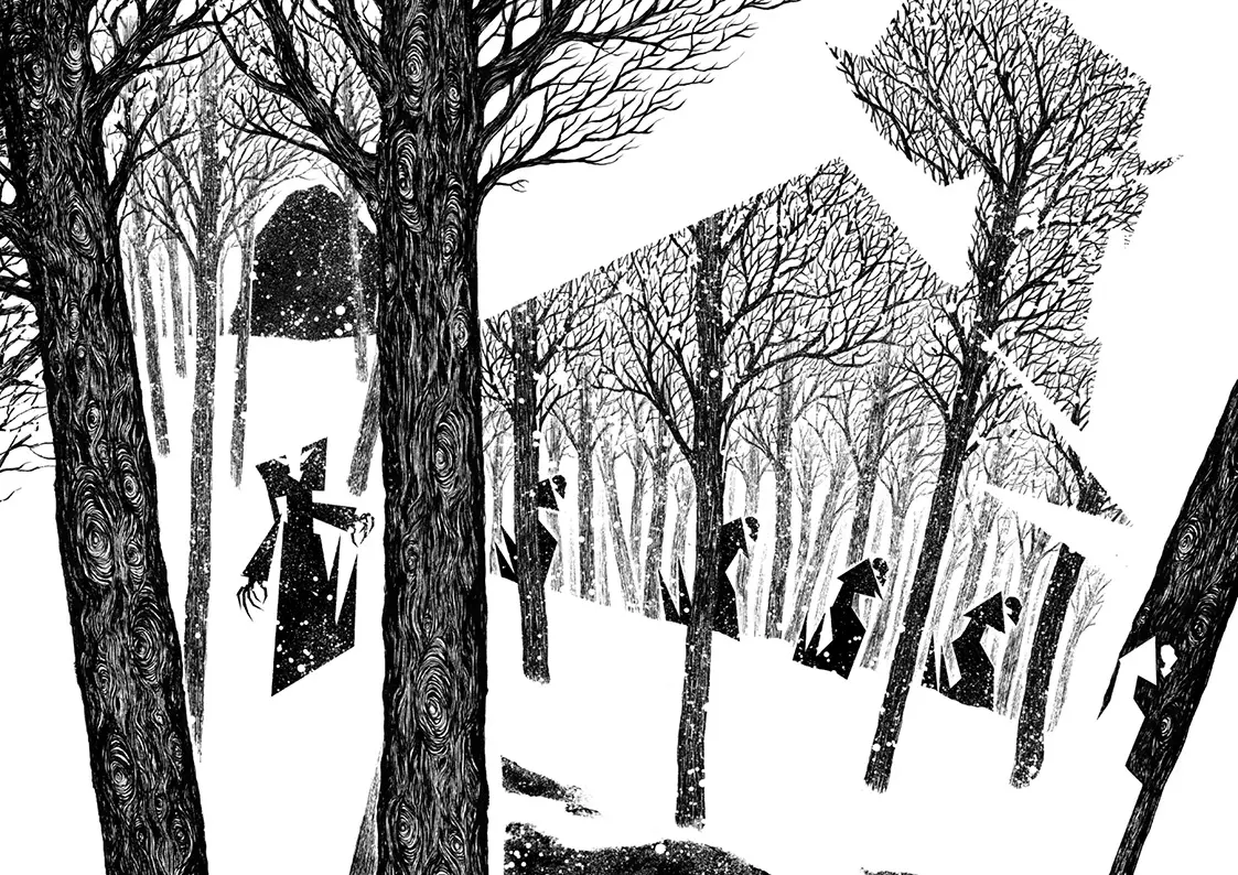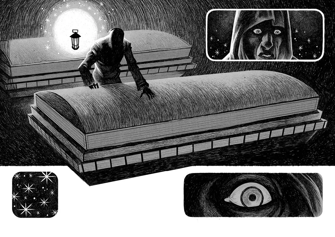 La première est absolument silencieuse. On y suit la créature qui rentre dans son domaine afin d’y mourir. Une créature d’horreur, faite de pellicule de cinéma. Fontanili y déploie un dessin très inspiré de l’expressionnisme allemand (source d’inspiration du Nosferatu de Friedrich W. Murnau), fait de formes géométriques saillantes. Chaque page y développe des trésors d’ingéniosité pour intégrer des artifices graphiques au sein de la narration. L’auteur cherche à nous entraîner dans ce monde entre papier et plastique, entre bande dessinée et cinéma. Il ne consent à nous libérer qu’à la fin de la séquence, lorsque la créature semble partir.