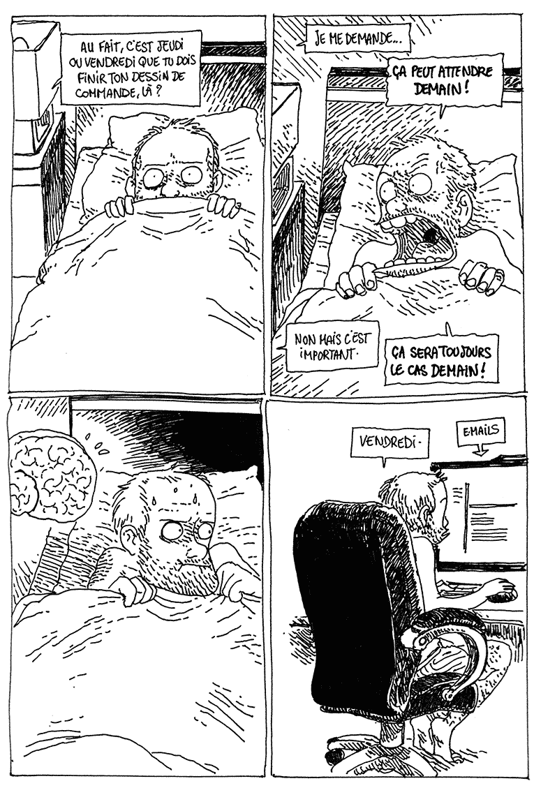 Boulet est également très actif sur Twitter, et quand il s’ennuie dans le train, il demande des thèmes idiots à ses followers, et les dessine ensuite pendant le trajet.