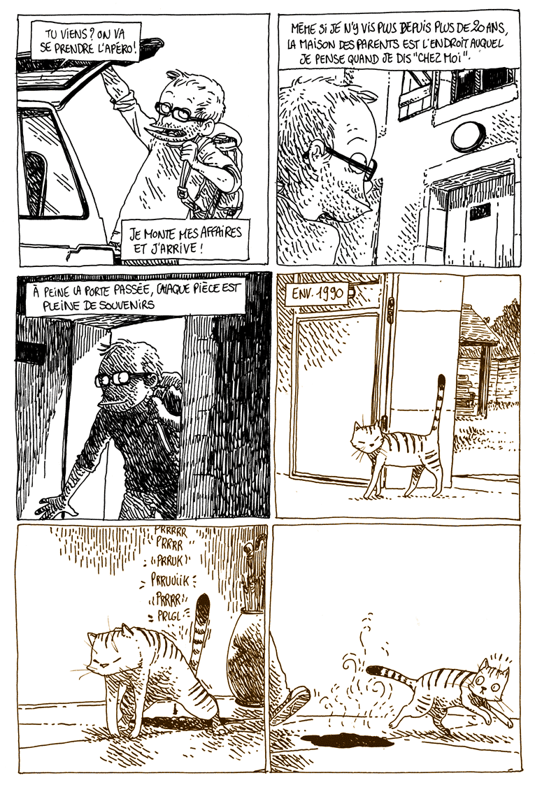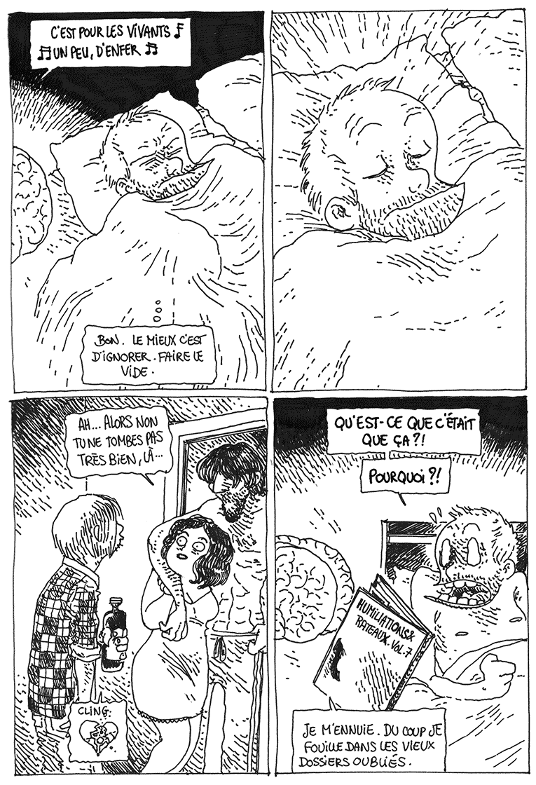 Il ajoute à ces récits, des moments où il parle de son travail de dessinateur, de séduction (la casquette Louis Vuitton), de ménage de printemps où il doit faire de la place dans ses étagères, de fantasy dans Moment magique où il se met en scène dans la peau d’un élève de Poudlard (le choixpeau lui octroie la maison Poufsouffle), les mystères de la science et la science-fiction où il rend un bel hommage à Moebius.